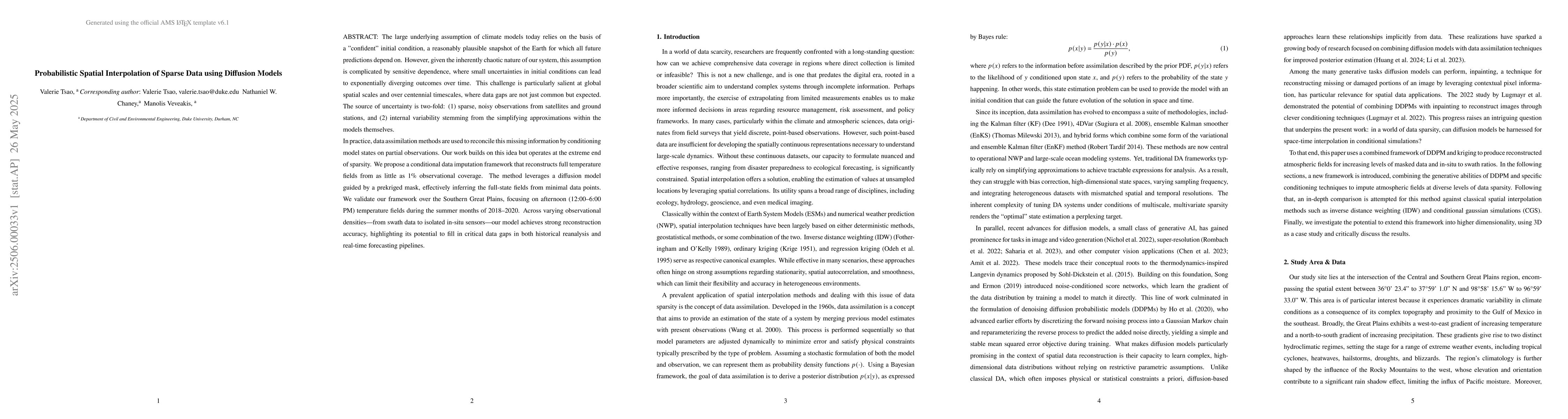 The research proposes a conditional data imputation framework using a diffusion model guided by a prekriged mask to reconstruct full temperature fields from as little as 1% observational coverage, validated over the Southern Great Plains for afternoon summer temperature fields from 2018-2020.