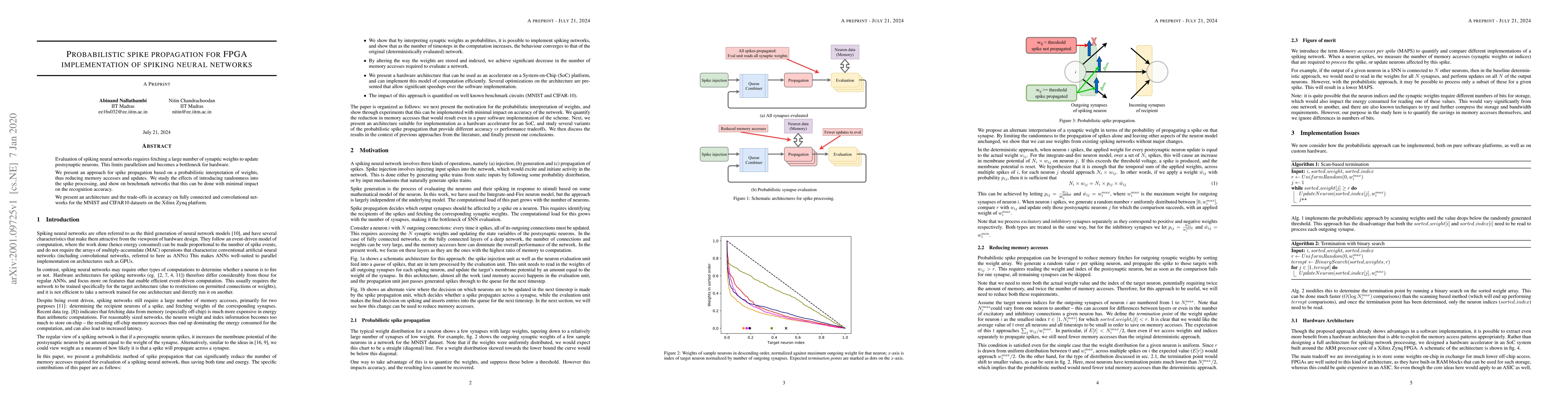 This paper proposes a probabilistic method for spike propagation in spiking neural networks implemented on FPGAs to reduce memory access bottlenecks. The approach introduces randomness with minimal impact on recognition accuracy, demonstrated on benchmark networks using MNIST and CIFAR10 datasets.