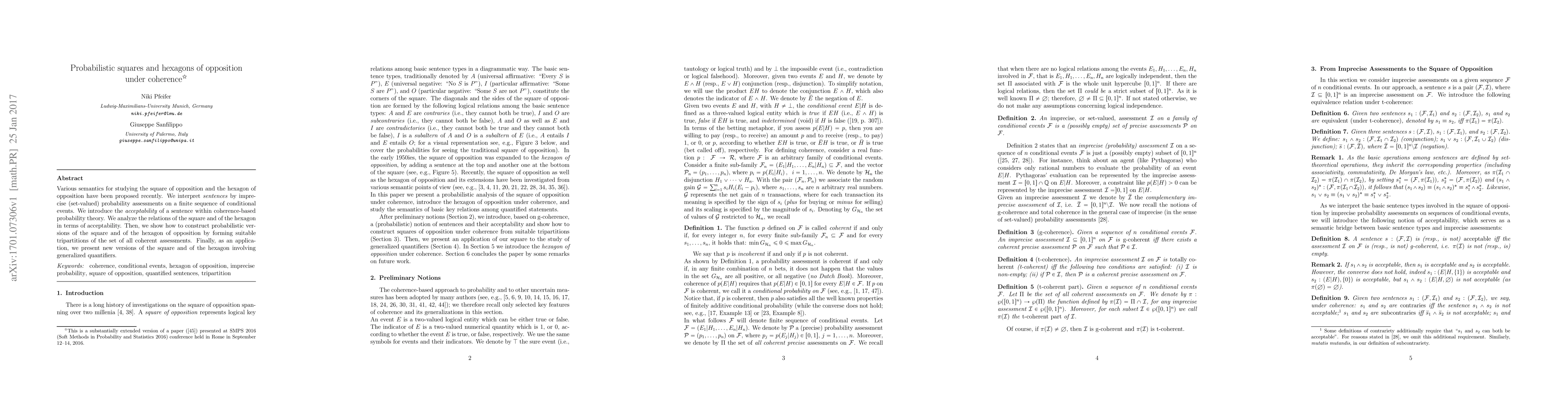 Various semantics for studying the square of opposition and the hexagon of opposition have been proposed recently. We interpret sentences by imprecise (set-valued) probability assessments on a finite sequence of conditional events. We introduce the acceptability of a sentence within coherence-based probability theory. We analyze the relations of the square and of the hexagon in terms of acceptability. Then, we show how to construct probabilistic versions of the square and of the hexagon of opposition by forming suitable tripartitions of the set of all coherent assessments. Finally, as an application, we present new versions of the square and of the hexagon involving generalized quantifiers.
