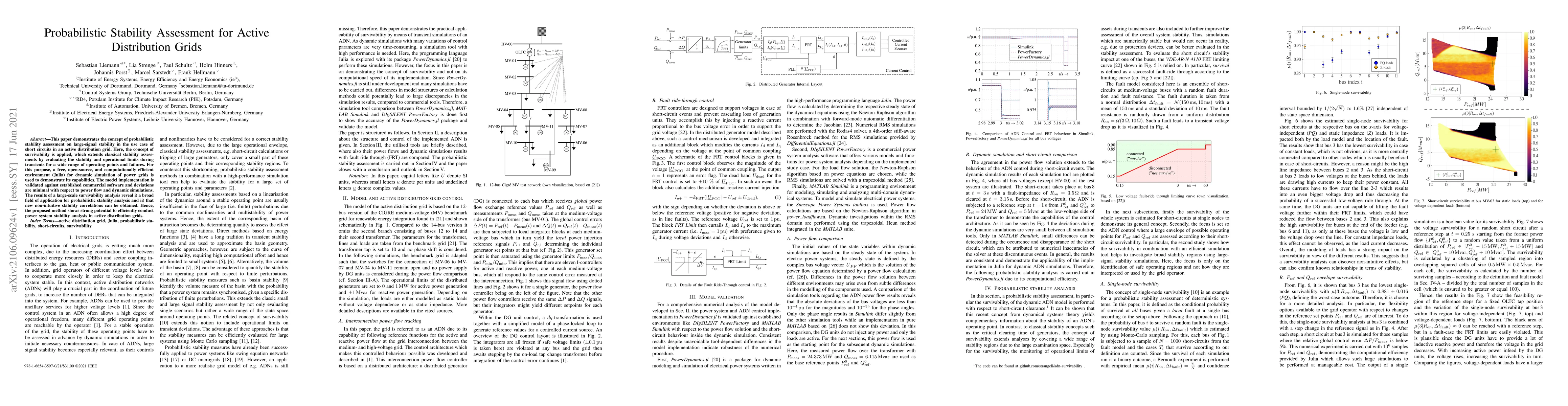 This paper demonstrates the concept of probabilistic stability assessment on large-signal stability in the use case of short circuits in an active distribution grid. Here, the concept of survivability is applied, which extends classical stability assessments by evaluating the stability and operational limits during transients for a wide range of operating points and failures. For this purpose, a free, open-source, and computationally efficient environment (Julia) for dynamic simulation of power grids is used to demonstrate its capabilities. The model implementation is validated against established commercial software and deviations are minimal with respect to power flow and dynamic simulations.The results of a large-scale survivability analysis reveal i) a broad field of application for probabilistic stability analysis and ii) that new non-intuitive stability correlations can be obtained. Hence,the proposed method shows strong potential to efficiently conduct power system stability analysis in active distribution grids.