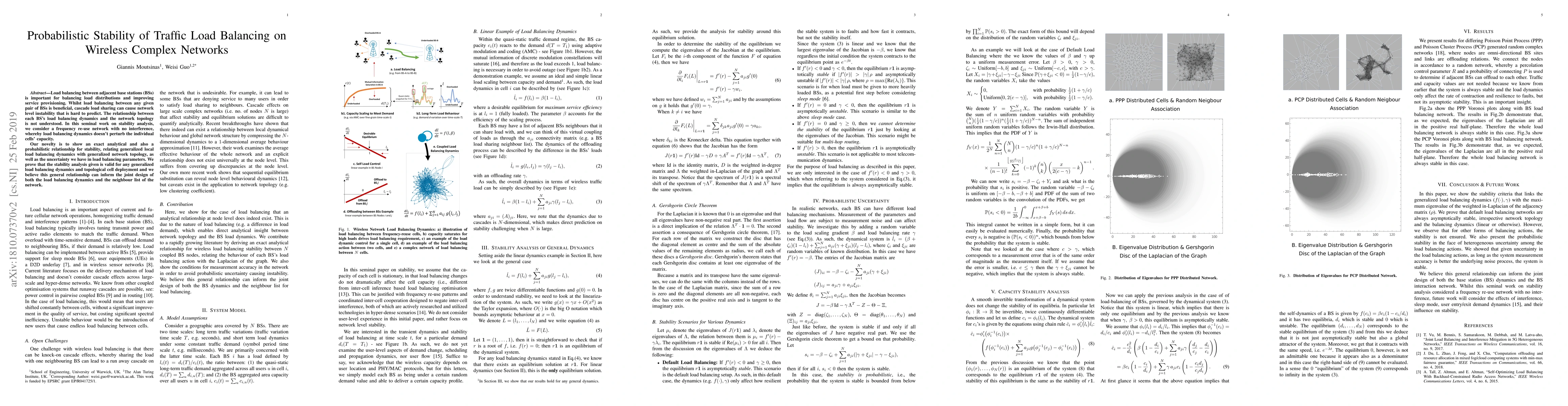 This paper investigates the probabilistic stability of traffic load balancing in wireless networks, establishing an analytical and probabilistic relationship between load balancing dynamics and network topology. It demonstrates that the stability analysis holds for any generalized load balancing dynamics and topological cell deployment, providing insights for joint design of load balancing and network structure.