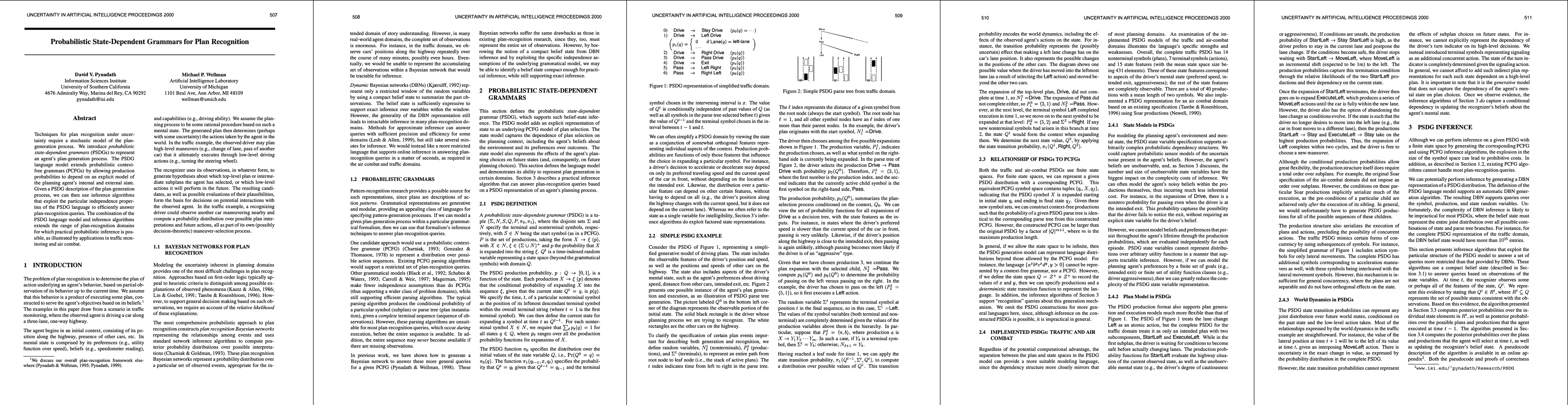 The paper proposes Probabilistic State-Dependent Grammars (PSDGs) to model an agent's plan-generation process under uncertainty, extending PCFGs by incorporating state-dependent production probabilities. It demonstrates the practical application of PSDGs in traffic monitoring and air combat through efficient inference algorithms.