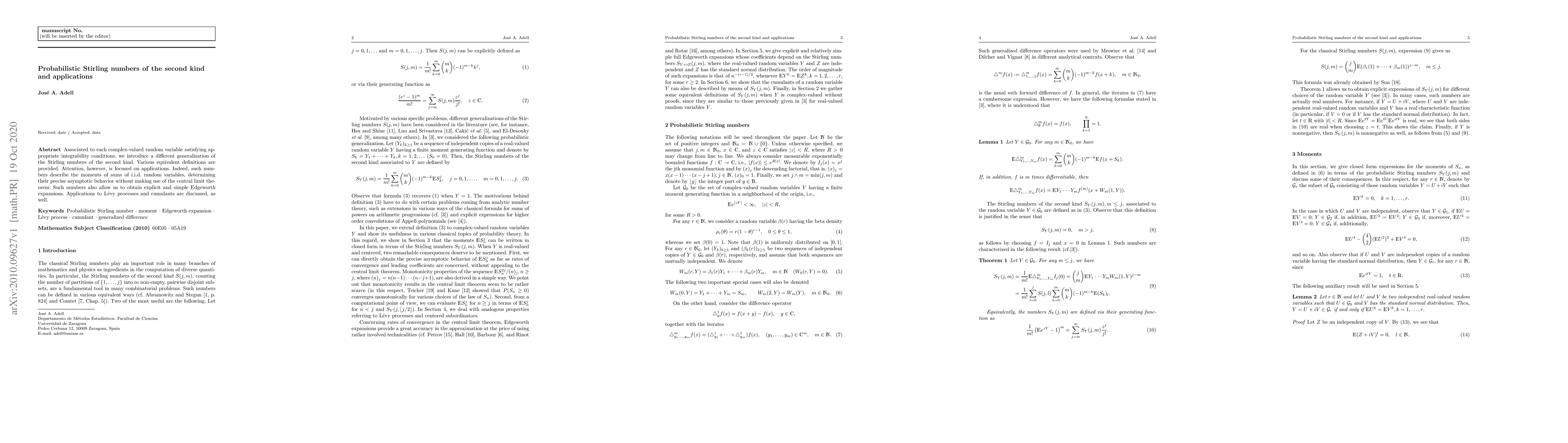 This paper introduces probabilistic generalizations of Stirling numbers of the second kind, defining them for complex-valued random variables and demonstrating their application in describing the moments of sums of independent and identically distributed random variables without relying on the central limit theorem. It also discusses applications to Lévy processes and cumulants, offering simple Edgeworth expansions.