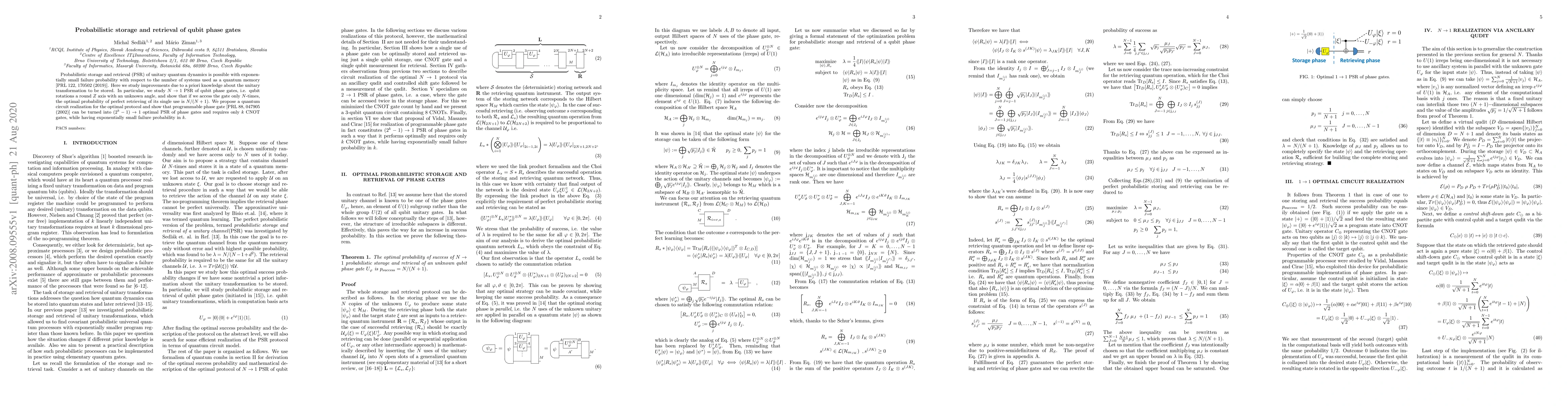 This paper investigates probabilistic storage and retrieval (PSR) of qubit phase gates, demonstrating that with prior knowledge of the unitary transformation, the optimal probability of perfect retrieval after $N$ accesses is $N/(N+1)$. The authors propose a quantum circuit that uses only $k$ CNOT gates to achieve $(2^k-1) \rightarrow 1$ optimal PSR with exponentially small failure probability.