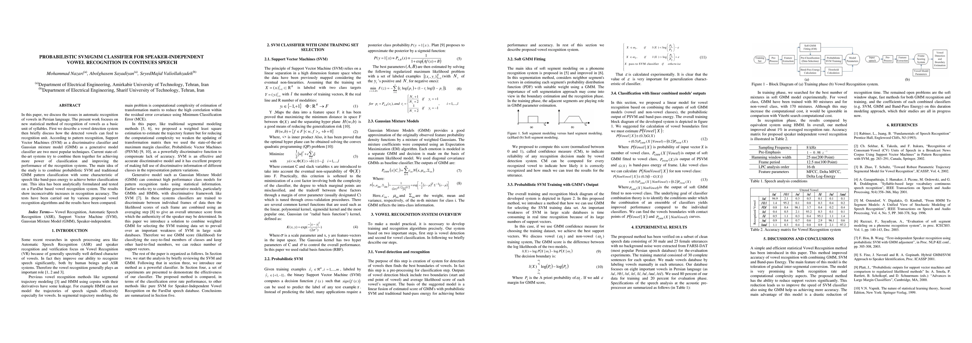 This paper explores the integration of probabilistic Support Vector Machines (SVM) and Gaussian Mixture Models (GMM) for enhancing vowel recognition in continuous Persian speech. The proposed method combines these classifiers with speech features like band-pass energy, achieving significant improvements in recognition accuracy over traditional algorithms.
