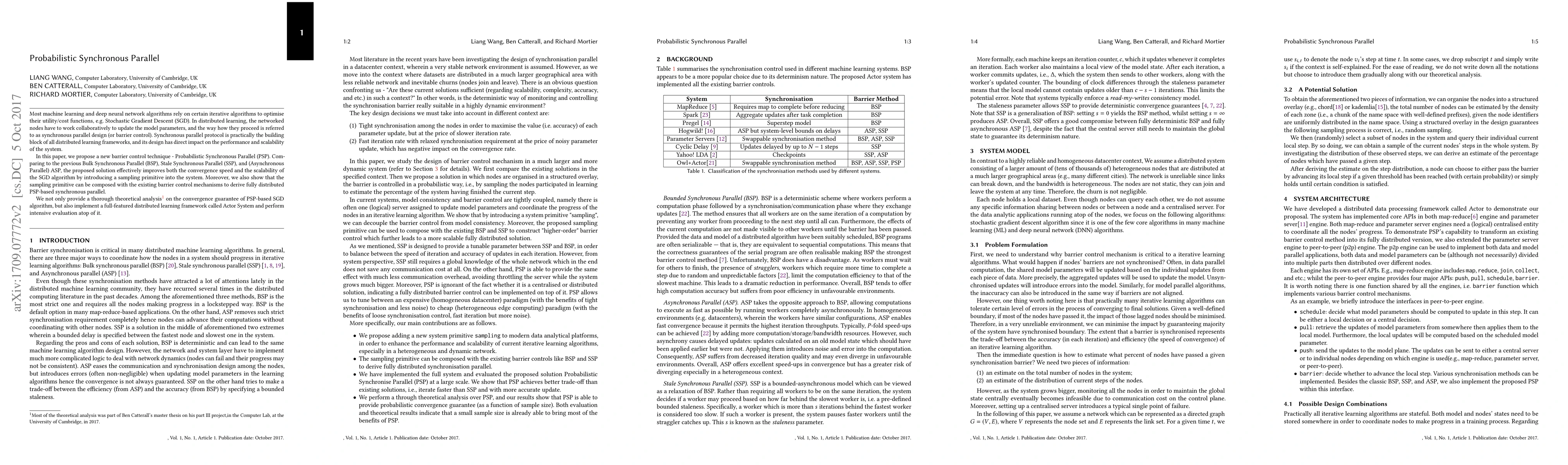 Most machine learning and deep neural network algorithms rely on certain iterative algorithms to optimise their utility/cost functions, e.g. Stochastic Gradient Descent. In distributed learning, the networked nodes have to work collaboratively to update the model parameters, and the way how they proceed is referred to as synchronous parallel design (or barrier control). Synchronous parallel protocol is the building block of any distributed learning framework, and its design has direct impact on the performance and scalability of the system. In this paper, we propose a new barrier control technique - Probabilistic Synchronous Parallel (PSP). Com- paring to the previous Bulk Synchronous Parallel (BSP), Stale Synchronous Parallel (SSP), and (Asynchronous Parallel) ASP, the proposed solution e ectively improves both the convergence speed and the scalability of the SGD algorithm by introducing a sampling primitive into the system. Moreover, we also show that the sampling primitive can be applied atop of the existing barrier control mechanisms to derive fully distributed PSP-based synchronous parallel. We not only provide a thorough theoretical analysis1 on the convergence of PSP-based SGD algorithm, but also implement a full-featured distributed learning framework called Actor and perform intensive evaluation atop of it.