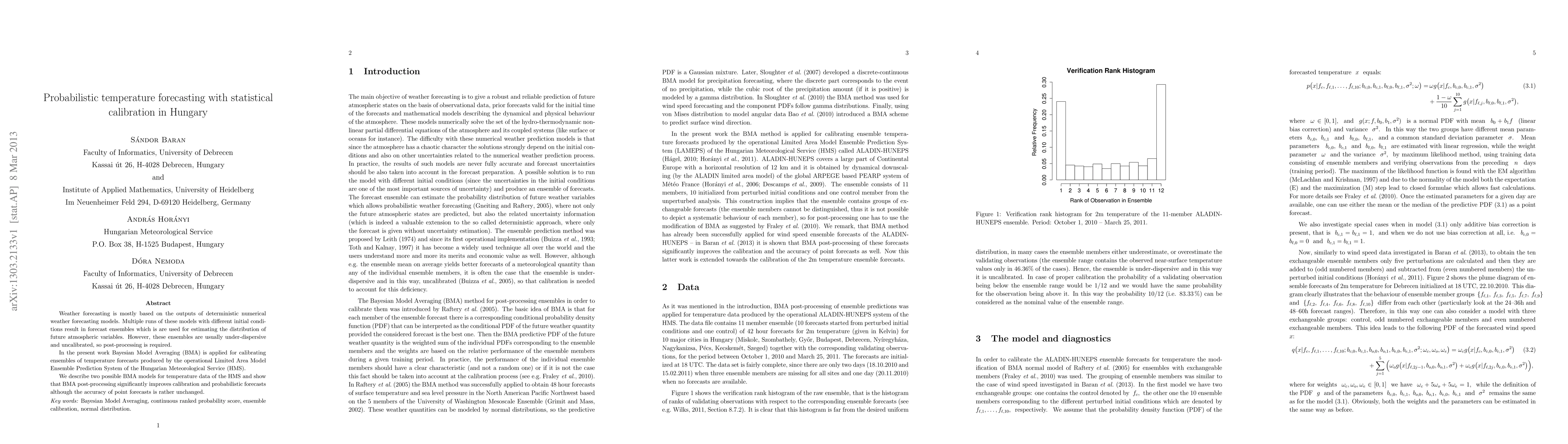 A study uses Bayesian Model Averaging to improve probabilistic temperature forecasts in Hungary, showing that post-processing significantly enhances calibration without changing point forecast accuracy.