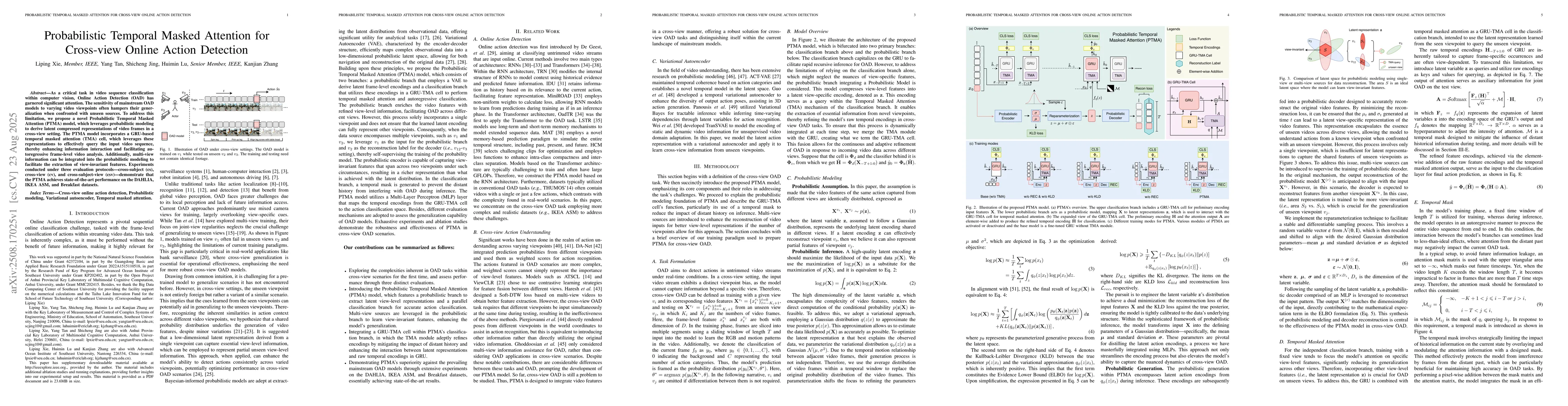 As a critical task in video sequence classification within computer vision, Online Action Detection (OAD) has garnered significant attention. The sensitivity of mainstream OAD models to varying video viewpoints often hampers their generalization when confronted with unseen sources. To address this limitation, we propose a novel Probabilistic Temporal Masked Attention (PTMA) model, which leverages probabilistic modeling to derive latent compressed representations of video frames in a cross-view setting. The PTMA model incorporates a GRU-based temporal masked attention (TMA) cell, which leverages these representations to effectively query the input video sequence, thereby enhancing information interaction and facilitating autoregressive frame-level video analysis. Additionally, multi-view information can be integrated into the probabilistic modeling to facilitate the extraction of view-invariant features. Experiments conducted under three evaluation protocols: cross-subject (cs), cross-view (cv), and cross-subject-view (csv) show that PTMA achieves state-of-the-art performance on the DAHLIA, IKEA ASM, and Breakfast datasets.