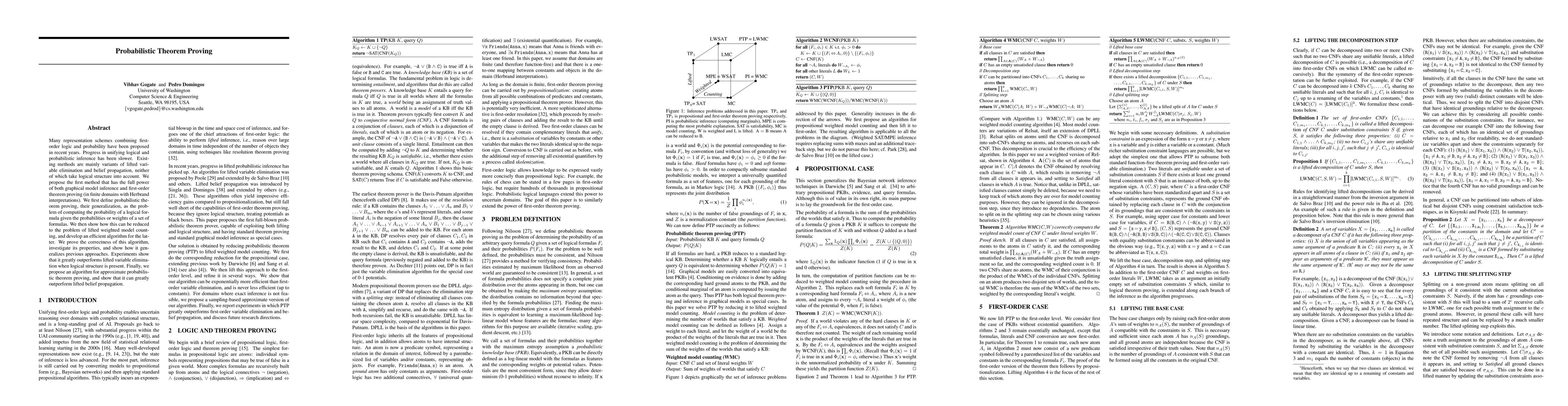 This paper introduces a novel method for probabilistic theorem proving that combines the strengths of graphical model inference and first-order theorem proving. It outperforms existing methods like lifted variable elimination and belief propagation, especially when logical structure is significant.