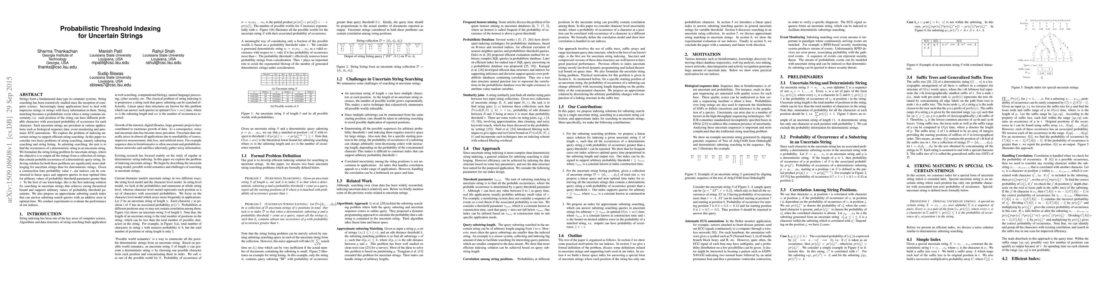 This paper proposes probabilistic indexing methods for uncertain strings, addressing substring searching and string listing challenges. The proposed indexes achieve linear space construction and near-optimal query performance for various probability thresholds, offering the first solution with strong theoretical bounds for uncertain string searching.