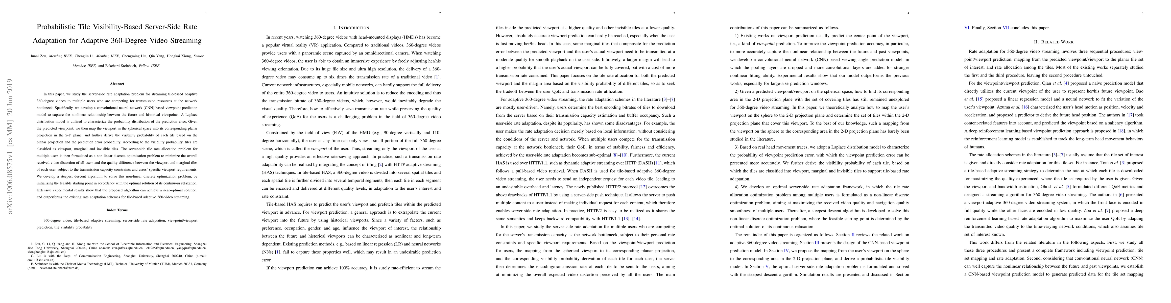 This paper proposes a server-side rate adaptation method for streaming adaptive 360-degree videos using a CNN-based viewpoint prediction model and a Laplace distribution to determine tile visibility probabilities. The method optimizes tile rate allocation to minimize video distortion across users while adhering to network constraints.