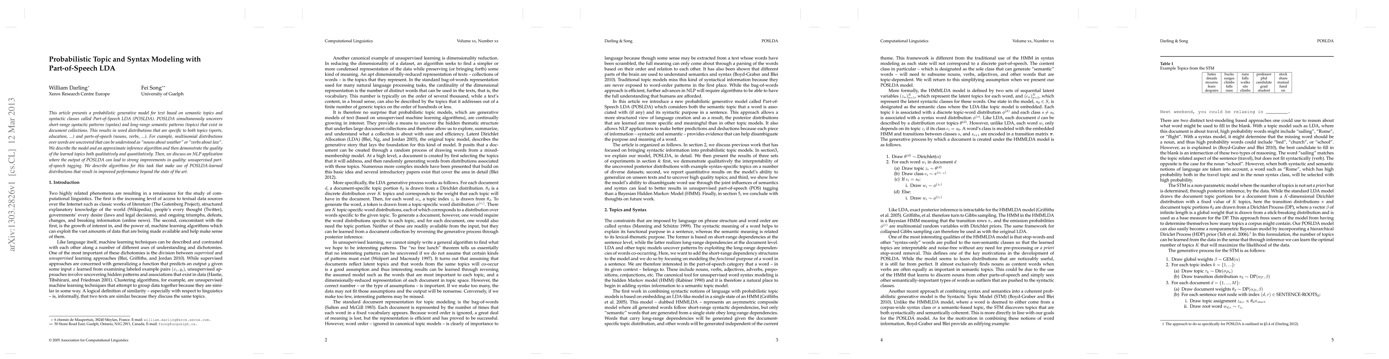This article presents a probabilistic generative model for text based on semantic topics and syntactic classes called Part-of-Speech LDA (POSLDA). POSLDA simultaneously uncovers short-range syntactic patterns (syntax) and long-range semantic patterns (topics) that exist in document collections. This results in word distributions that are specific to both topics (sports, education, ...) and parts-of-speech (nouns, verbs, ...). For example, multinomial distributions over words are uncovered that can be understood as "nouns about weather" or "verbs about law". We describe the model and an approximate inference algorithm and then demonstrate the quality of the learned topics both qualitatively and quantitatively. Then, we discuss an NLP application where the output of POSLDA can lead to strong improvements in quality: unsupervised part-of-speech tagging. We describe algorithms for this task that make use of POSLDA-learned distributions that result in improved performance beyond the state of the art.