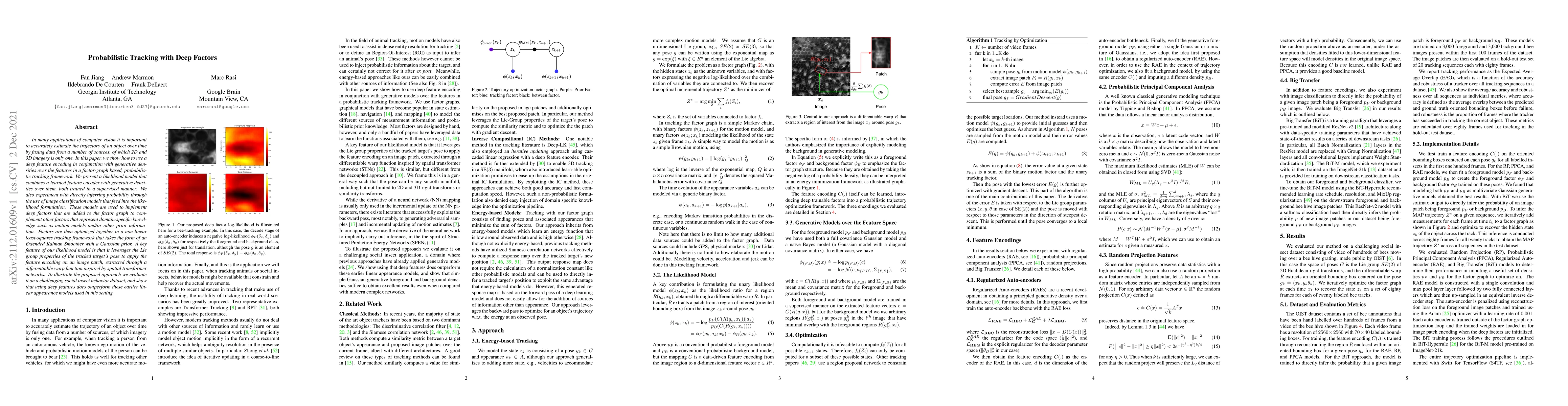 In many applications of computer vision it is important to accurately estimate the trajectory of an object over time by fusing data from a number of sources, of which 2D and 3D imagery is only one. In this paper, we show how to use a deep feature encoding in conjunction with generative densities over the features in a factor-graph based, probabilistic tracking framework. We present a likelihood model that combines a learned feature encoder with generative densities over them, both trained in a supervised manner. We also experiment with directly inferring probability through the use of image classification models that feed into the likelihood formulation. These models are used to implement deep factors that are added to the factor graph to complement other factors that represent domain-specific knowledge such as motion models and/or other prior information. Factors are then optimized together in a non-linear least-squares tracking framework that takes the form of an Extended Kalman Smoother with a Gaussian prior. A key feature of our likelihood model is that it leverages the Lie group properties of the tracked target's pose to apply the feature encoding on an image patch, extracted through a differentiable warp function inspired by spatial transformer networks. To illustrate the proposed approach we evaluate it on a challenging social insect behavior dataset, and show that using deep features does outperform these earlier linear appearance models used in this setting.