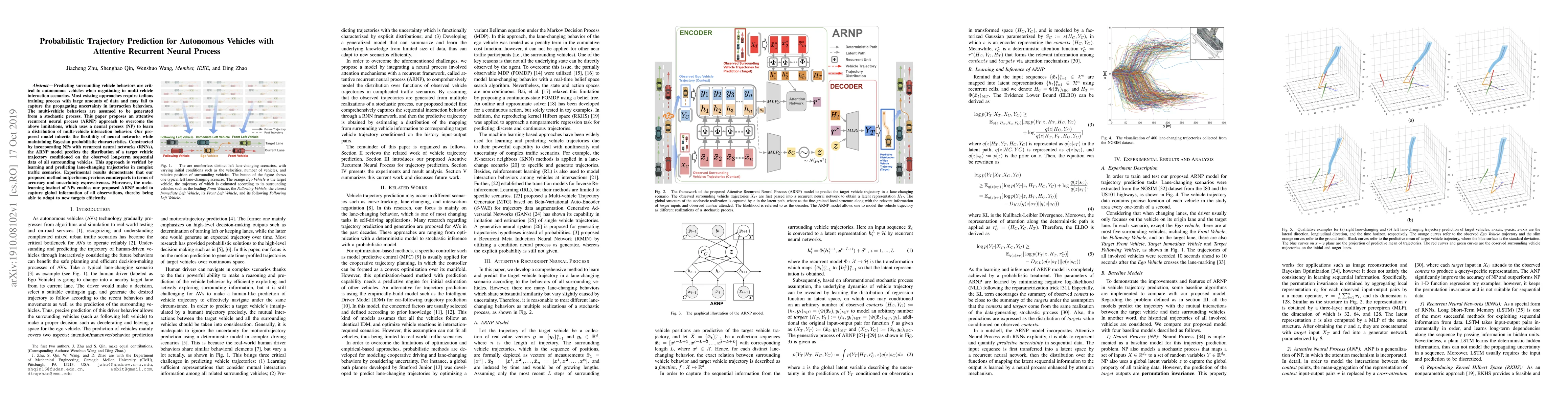 This paper introduces an attentive recurrent neural process (ARNP) to predict vehicle trajectories in autonomous driving scenarios, combining neural processes with recurrent neural networks for probabilistic predictions. The ARNP model effectively captures uncertainty and outperforms existing methods by learning from long-term sequential data of surrounding vehicles.