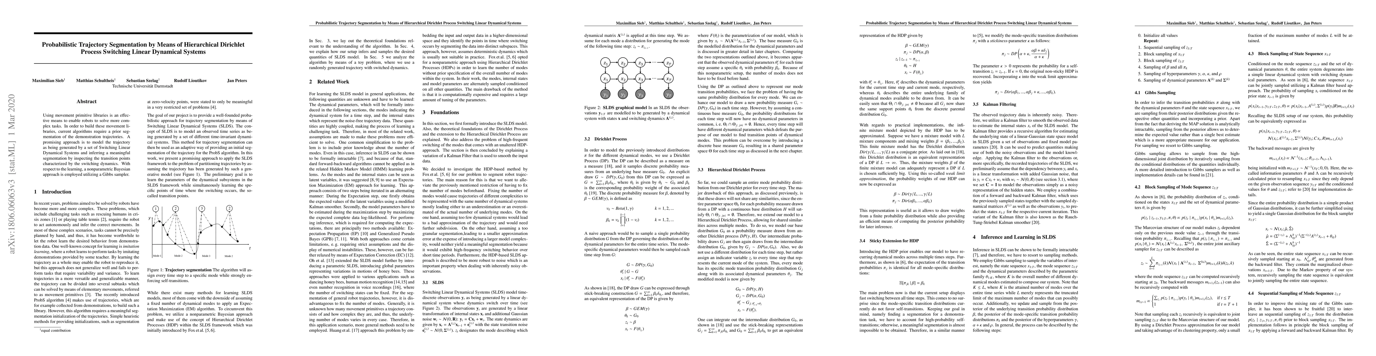 This paper proposes a method for segmenting robot demonstration trajectories using Switching Linear Dynamical Systems and a Hierarchical Dirichlet Process. The approach leverages a nonparametric Bayesian model with a Gibbs sampler to infer meaningful segmentation points.