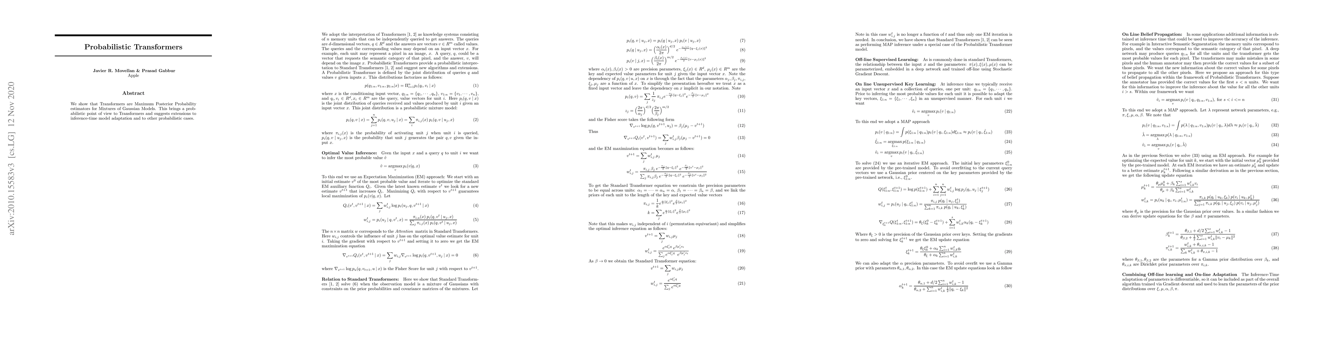 We show that Transformers are Maximum Posterior Probability estimators for Mixtures of Gaussian Models. This brings a probabilistic point of view to Transformers and suggests extensions to other probabilistic cases.