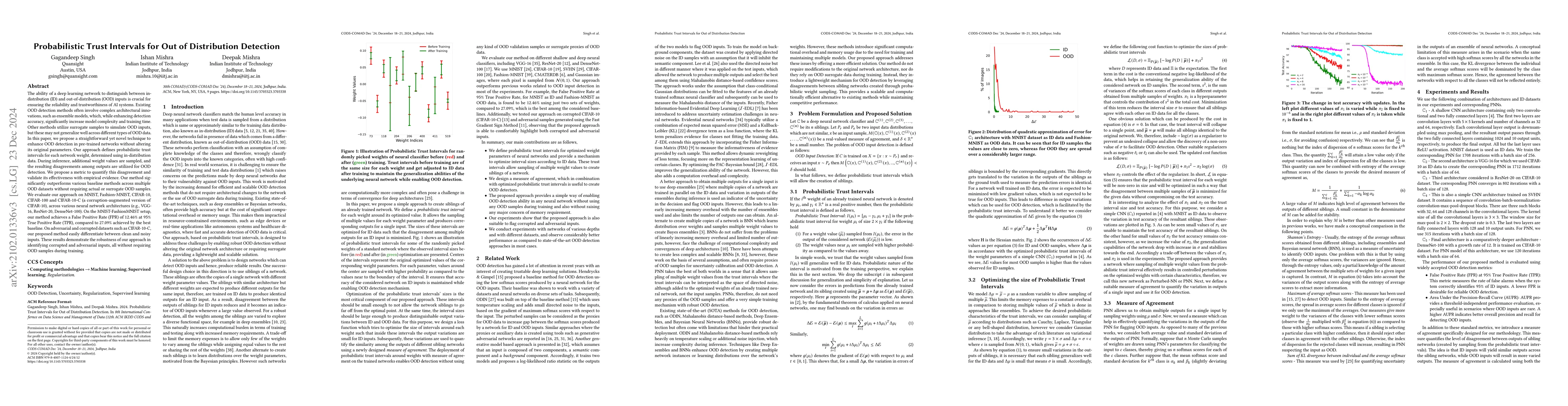 Building neural network classifiers with an ability to distinguish between in and out-of distribution inputs is an important step towards faithful deep learning systems. Some of the successful approaches for this, resort to architectural novelties, such as ensembles, with increased complexities in terms of the number of parameters and training procedures. Whereas some other approaches make use of surrogate samples, which are easy to create and work as proxies for actual out-of-distribution (OOD) samples, to train the networks for OOD detection. In this paper, we propose a very simple approach for enhancing the ability of a pretrained network to detect OOD inputs without even altering the original parameter values. We define a probabilistic trust interval for each weight parameter of the network and optimize its size according to the in-distribution (ID) inputs. It allows the network to sample additional weight values along with the original values at the time of inference and use the observed disagreement among the corresponding outputs for OOD detection. In order to capture the disagreement effectively, we also propose a measure and establish its suitability using empirical evidence. Our approach outperforms the existing state-of-the-art methods on various OOD datasets by considerable margins without using any real or surrogate OOD samples. We also analyze the performance of our approach on adversarial and corrupted inputs such as CIFAR-10-C and demonstrate its ability to clearly distinguish such inputs as well. By using fundamental theorem of calculus on neural networks, we explain why our technique doesn't need to observe OOD samples during training to achieve results better than the previous works.