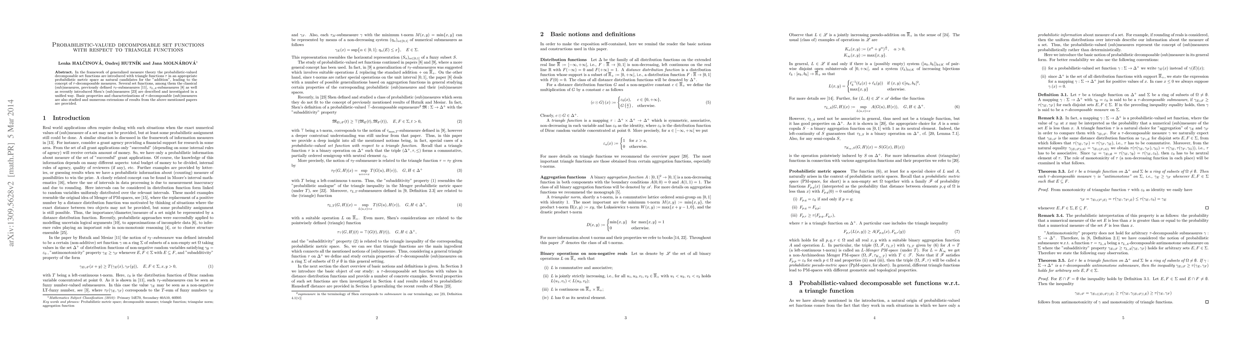 Researchers introduce a framework for probabilistic-valued set functions using triangle functions, providing a unified approach to classic measures and new concepts like Shen's measures. This work explores basic properties and characterizations of these functions, with implications for various extensions of existing results.