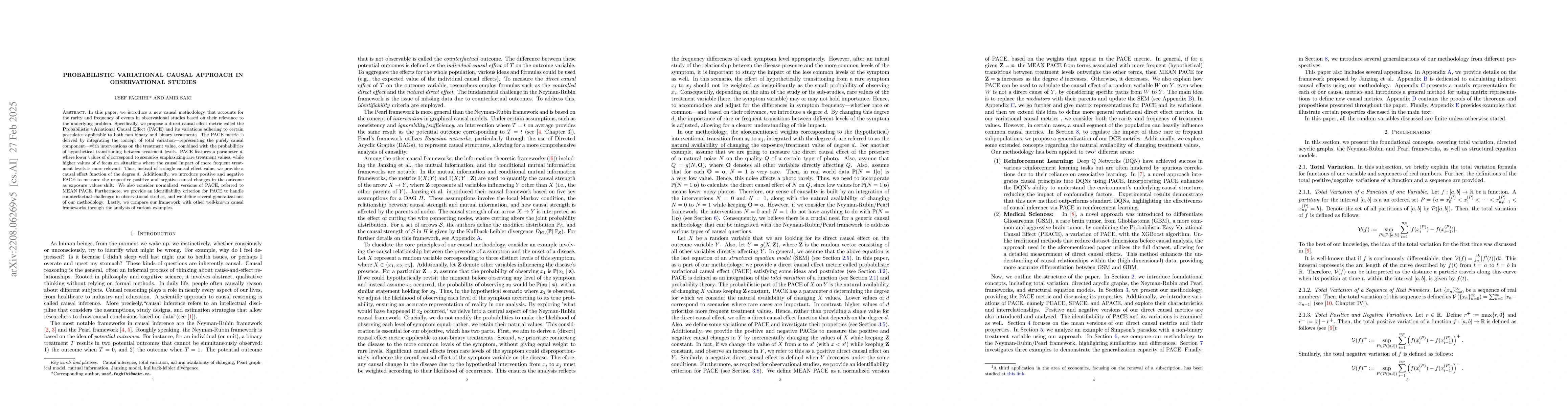 In this paper, we introduce a new causal framework capable of dealing with probabilistic and non-probabilistic problems. Indeed, we provide a direct causal effect formula called Probabilistic vAriational Causal Effect (PACE) and its variations satisfying some ideas and postulates. Our formula of causal effect uses the idea of the total variation of a function integrated with probability theory. The probabilistic part is the natural availability of changing an exposure values given some variables. These variables interfere with the effect of the exposure on a given outcome. PACE has a parameter $d$ determining the degree of considering the natural availability of changing the exposure values. The lower values of $d$ refer to the scenarios for which rare cases are important. In contrast, with the higher values of $d$, our framework deals with the problems that are in nature probabilistic. Hence, instead of a single value for causal effect, we provide a causal effect vector by discretizing $d$. Further, we introduce the positive and negative PACE to measure the positive and the negative causal changes in the outcome while changing the exposure values. Furthermore, we provide an identifiability criterion for PACE to deal with observational studies. We also address the problem of computing counterfactuals in causal reasoning. We compare our framework to the Pearl, the mutual information, the conditional mutual information, and the Janzing et al. frameworks by investigating several examples.
