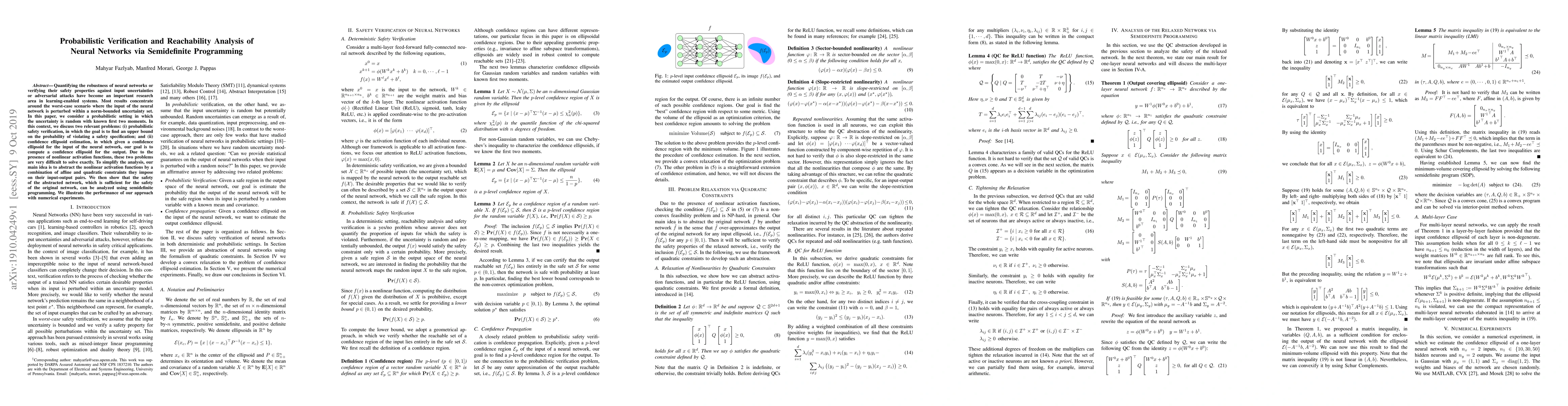 This paper proposes a probabilistic approach for verifying the safety of neural networks under random input uncertainties using semidefinite programming. It addresses probabilistic safety verification and confidence ellipsoid estimation by abstracting nonlinear activation functions into affine and quadratic constraints, enabling tractable analysis.