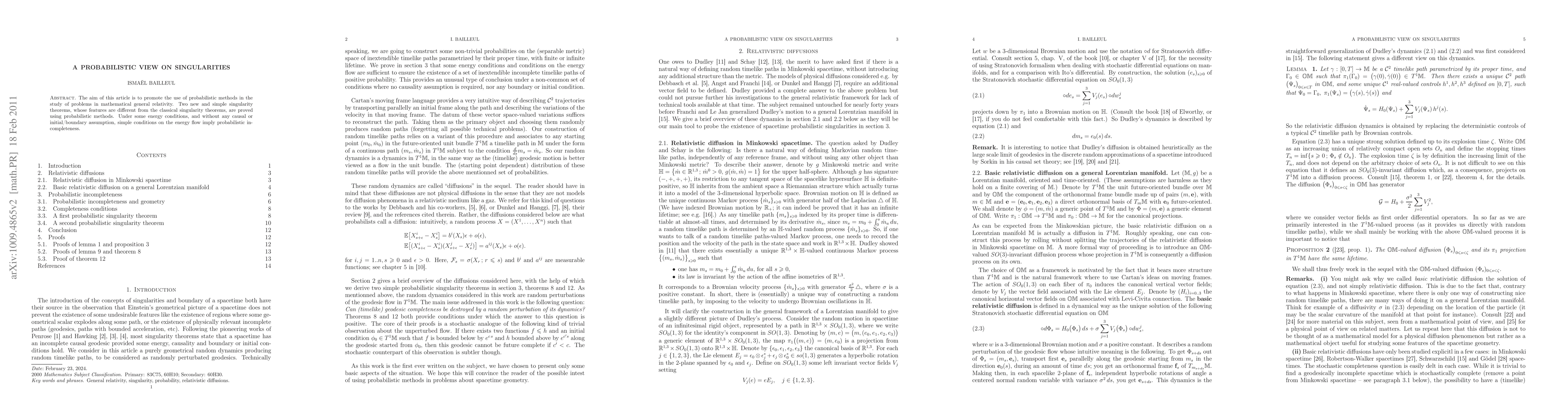 The aim of this article is to promote the use of probabilistic methods in the study of problems in mathematical general relativity. Two new and simple singularity theorems, whose features are different from the classical singularity theorems, are proved using probabilistic methods. Under some energy conditions, and without any causal or initial/boundary assumption, simple conditions on the energy flow imply probabilistic incompleteness. Also we introduce a probabilistic notion of spacetime boundary which has none of the pathological defects that the classical boundaries may have.