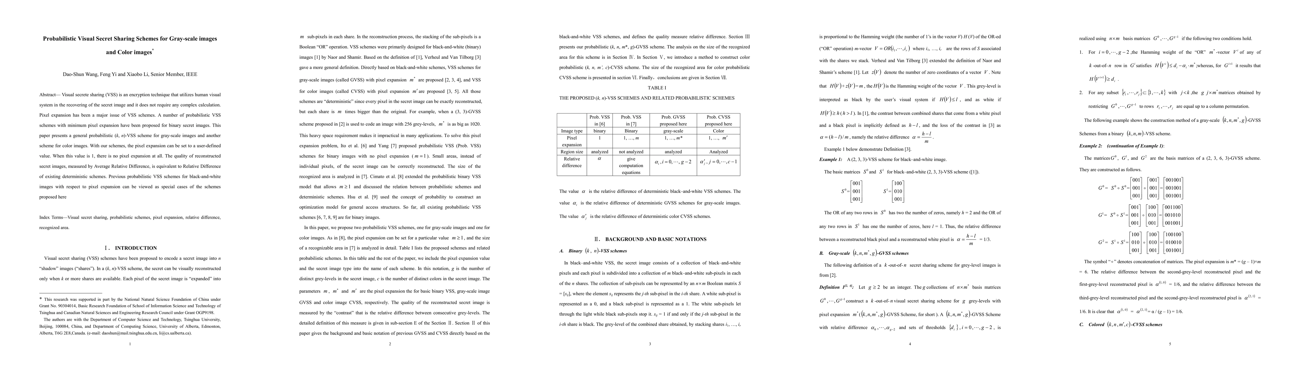 This paper presents probabilistic visual secret sharing schemes for both gray-scale and color images with adjustable pixel expansion, achieving quality comparable to existing deterministic schemes.
