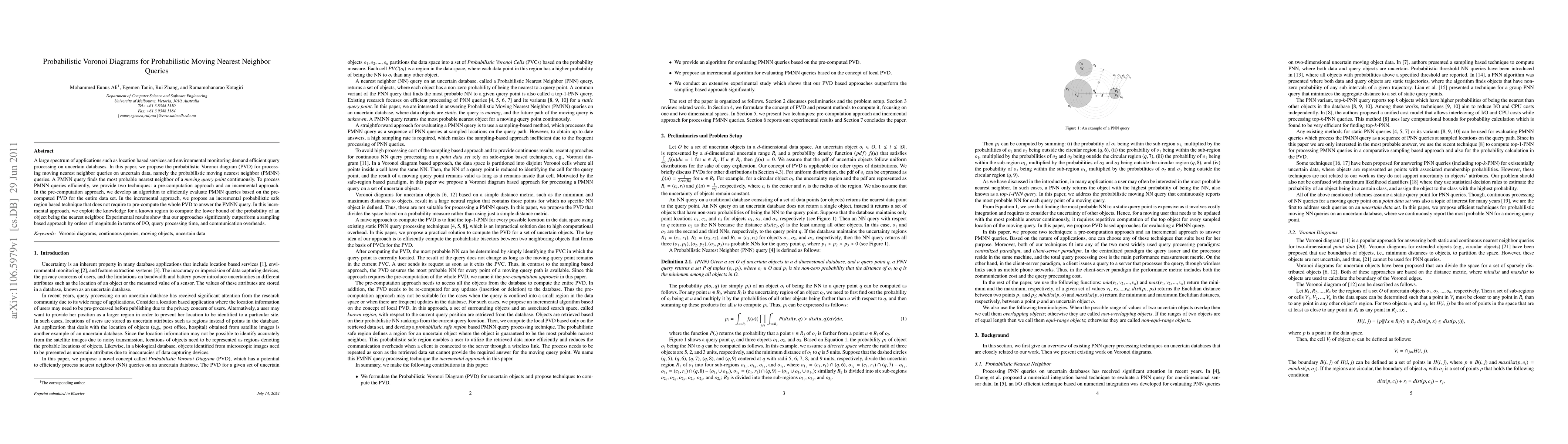 This paper proposes probabilistic Voronoi diagrams (PVD) for processing probabilistic moving nearest neighbor (PMNN) queries on uncertain data. It introduces two techniques: a pre-computation approach and an incremental approach, which outperform a sampling-based method in terms of I/O, query processing time, and communication overheads.