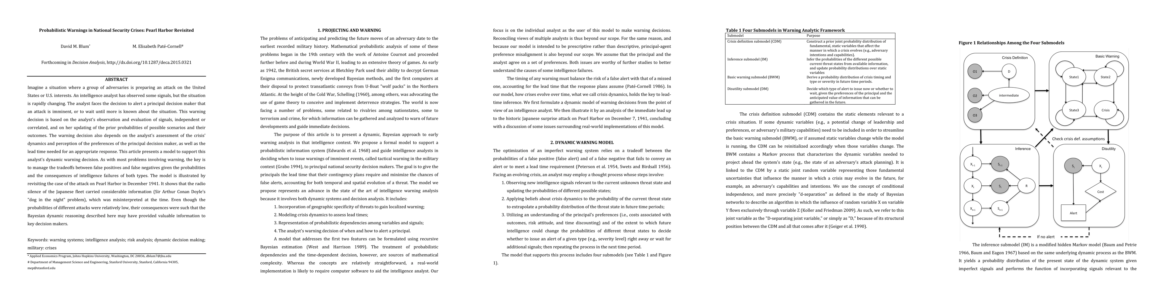 This paper develops a probabilistic model to aid intelligence analysts in making dynamic warning decisions during national security crises, balancing false positives and negatives. It revisits the Pearl Harbor attack, illustrating how misinterpretation of signals like radio silence could have been better managed using Bayesian reasoning.