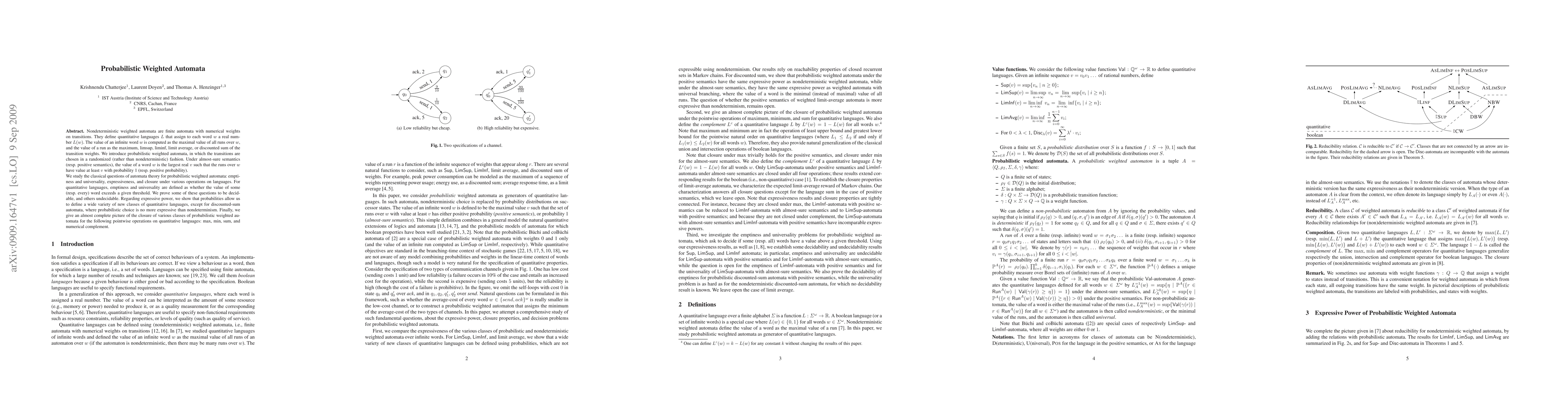 Nondeterministic weighted automata are finite automata with numerical weights on transitions. They define quantitative languages L that assign to each word w a real number L(w). The value of an infinite word w is computed as the maximal value of all runs over w, and the value of a run as the maximum, limsup, liminf, limit average, or discounted sum of the transition weights. We introduce probabilistic weighted automata, in which the transitions are chosen in a randomized (rather than nondeterministic) fashion. Under almost-sure semantics (resp. positive semantics), the value of a word w is the largest real v such that the runs over w have value at least v with probability 1 (resp. positive probability). We study the classical questions of automata theory for probabilistic weighted automata: emptiness and universality, expressiveness, and closure under various operations on languages. For quantitative languages, emptiness and universality are defined as whether the value of some (resp. every) word exceeds a given threshold. We prove some of these questions to be decidable, and others undecidable. Regarding expressive power, we show that probabilities allow us to define a wide variety of new classes of quantitative languages, except for discounted-sum automata, where probabilistic choice is no more expressive than nondeterminism. Finally, we give an almost complete picture of the closure of various classes of probabilistic weighted automata for the following pointwise operations on quantitative languages: max, min, sum, and numerical complement.