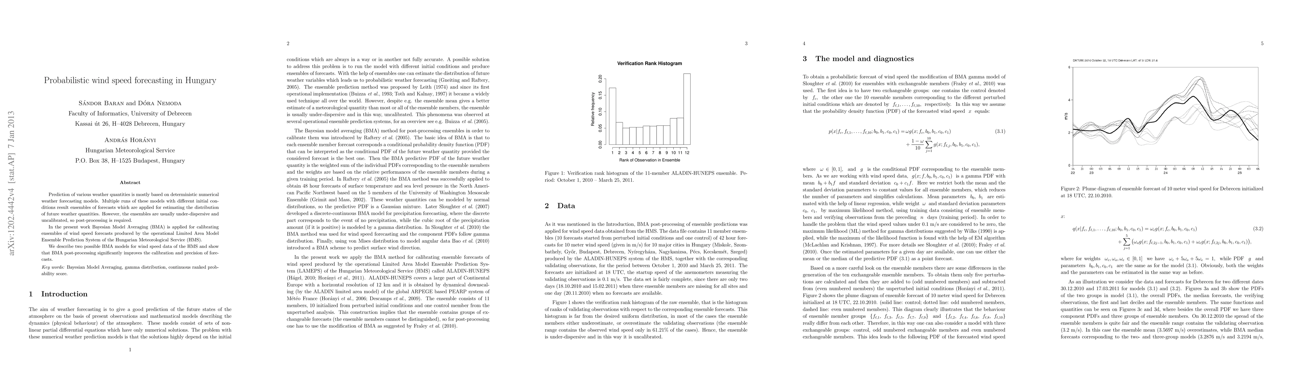 This paper applies Bayesian Model Averaging (BMA) to calibrate wind speed forecasts from the Hungarian Meteorological Service's ensemble prediction system, demonstrating significant improvements in forecast calibration and precision over deterministic models.