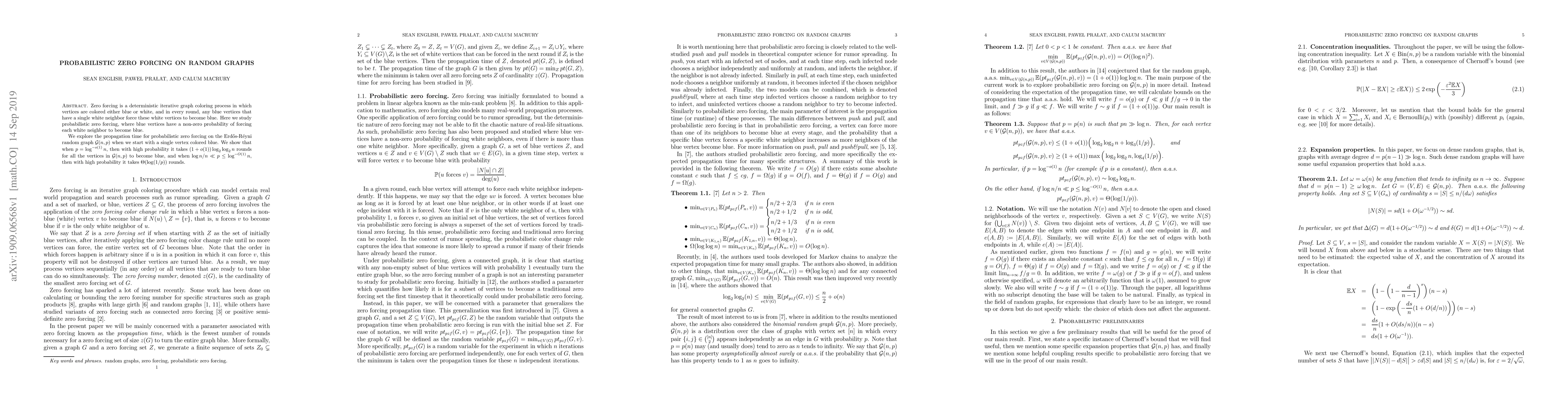 The research analyzes probabilistic zero forcing on random graphs, specifically the Erdős-Rényi model (G(n,p)), focusing on the propagation time starting from a single blue vertex.