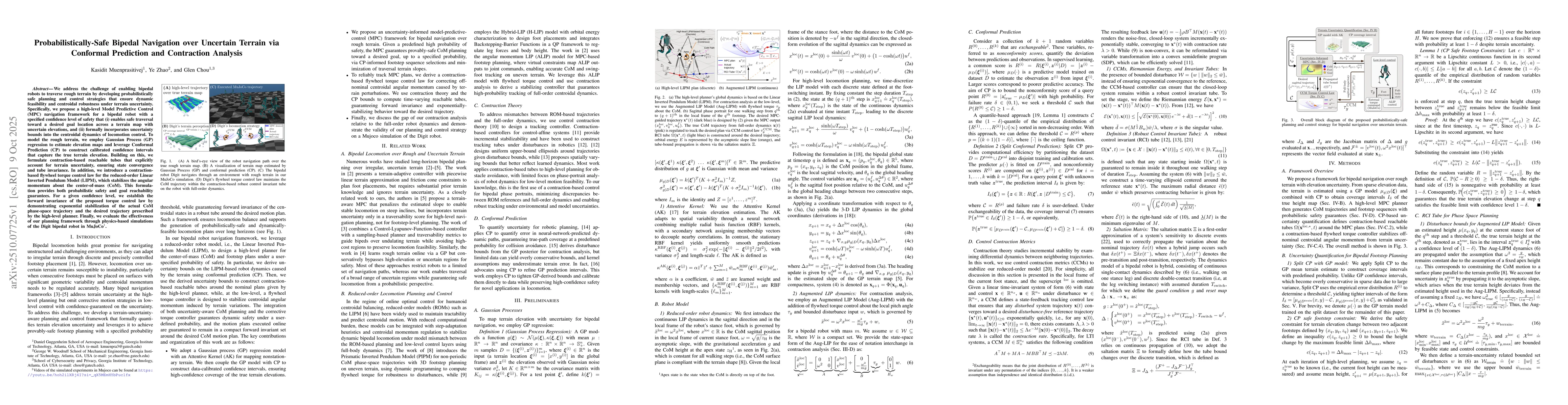 First integration of Gaussian Process terrain estimation with Conformal Prediction for probabilistic coverage guarantees, combined with Control Contraction Metrics for stable locomotion control, creating a unified framework for safe robot navigation in uncertain environments.