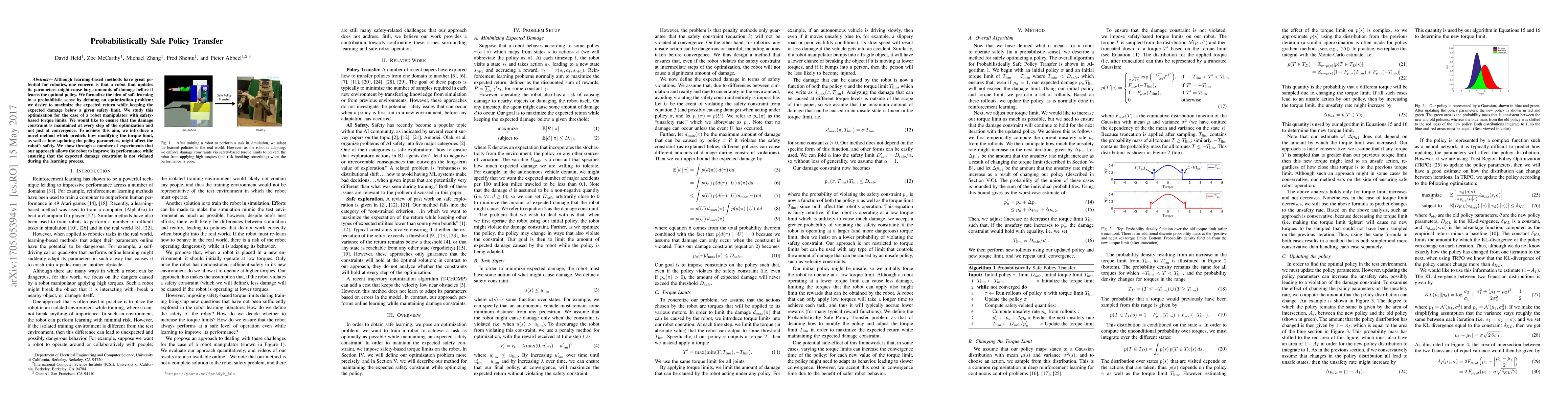 Although learning-based methods have great potential for robotics, one concern is that a robot that updates its parameters might cause large amounts of damage before it learns the optimal policy. We formalize the idea of safe learning in a probabilistic sense by defining an optimization problem: we desire to maximize the expected return while keeping the expected damage below a given safety limit. We study this optimization for the case of a robot manipulator with safety-based torque limits. We would like to ensure that the damage constraint is maintained at every step of the optimization and not just at convergence. To achieve this aim, we introduce a novel method which predicts how modifying the torque limit, as well as how updating the policy parameters, might affect the robot's safety. We show through a number of experiments that our approach allows the robot to improve its performance while ensuring that the expected damage constraint is not violated during the learning process.