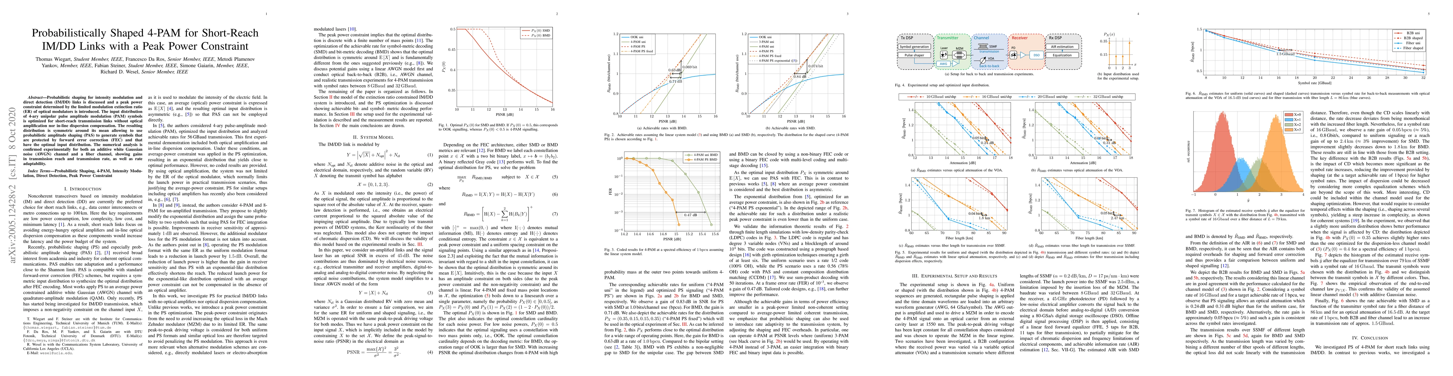 This paper optimizes the input distribution of 4-PAM symbols for short-reach IM/DD links under peak power constraints, achieving improved transmission reach and rate through probabilistic shaping and forward error correction. Experimental results validate the theoretical gains in both AWGN and fiber channels.
