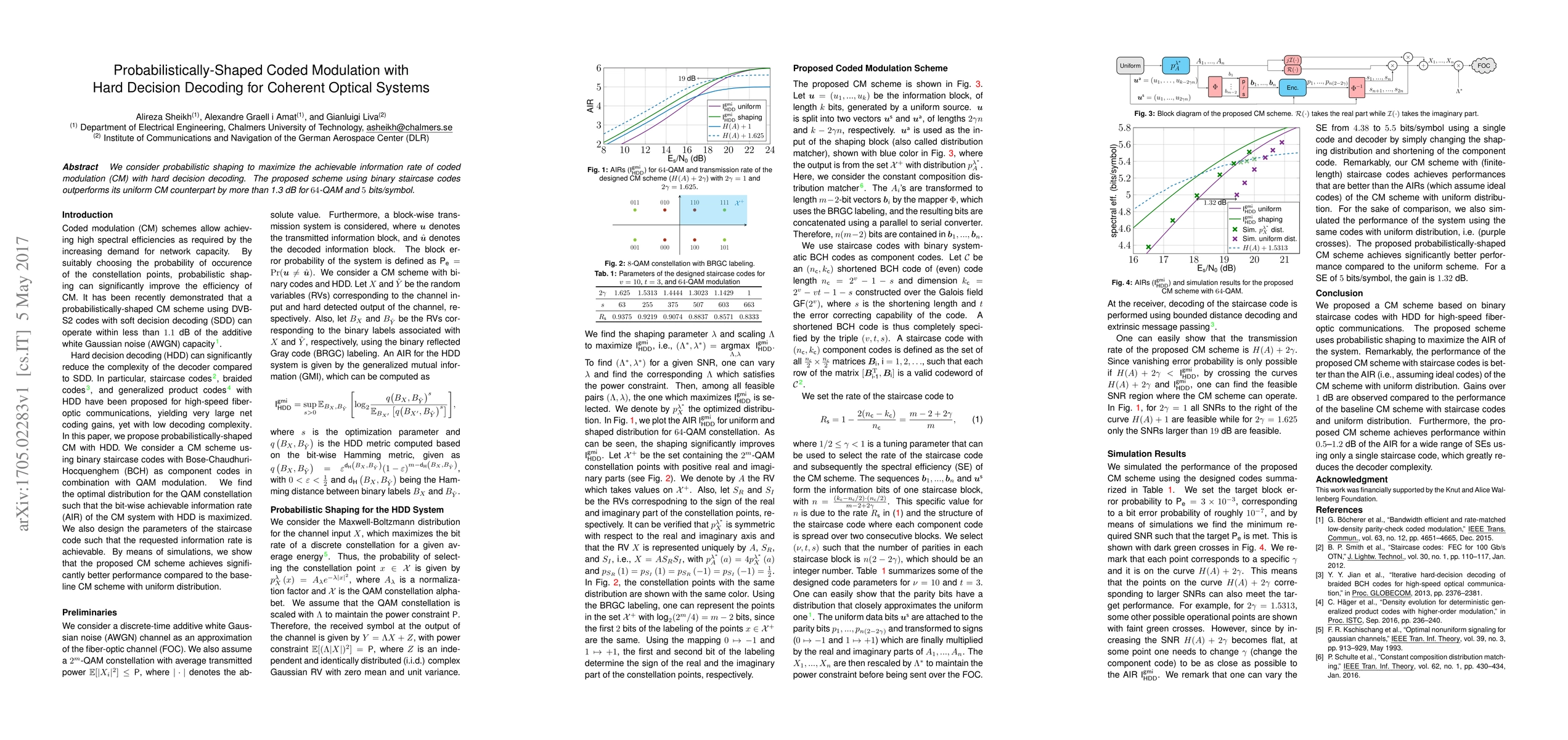 Summary: This paper proposes a probabilistically-shaped coded modulation scheme with hard decision decoding for coherent optical systems, which significantly improves the achievable information rate. The binary staircase codes used outperform uniform CM by over 1.3 dB for 64-QAM and 5 bits/symbol.