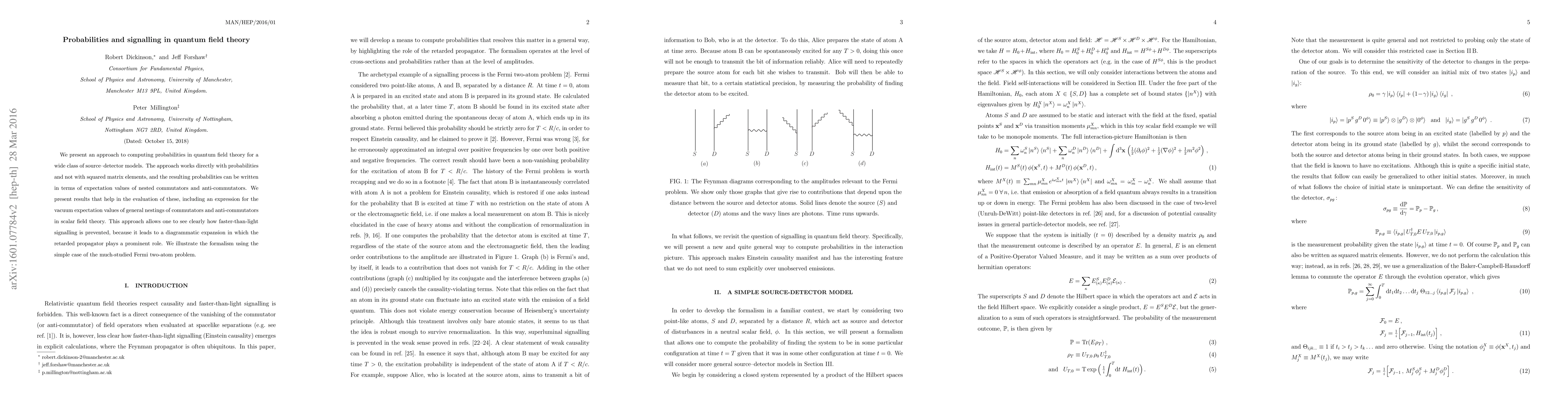 We present an approach to computing probabilities in quantum field theory for a wide class of source-detector models. The approach works directly with probabilities and not with squared matrix elements, and the resulting probabilities can be written in terms of expectation values of nested commutators and anti-commutators. We present results that help in the evaluation of these, including an expression for the vacuum expectation values of general nestings of commutators and anti-commutators in scalar field theory. This approach allows one to see clearly how faster-than-light signalling is prevented, because it leads to a diagrammatic expansion in which the retarded propagator plays a prominent role. We illustrate the formalism using the simple case of the much-studied Fermi two-atom problem.