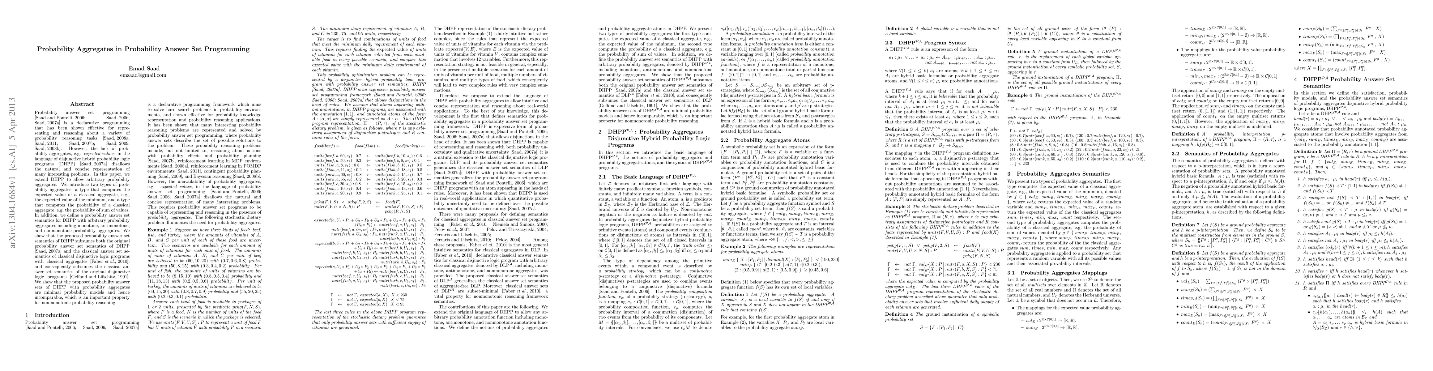 Probability answer set programming is a declarative programming that has been shown effective for representing and reasoning about a variety of probability reasoning tasks. However, the lack of probability aggregates, e.g. {\em expected values}, in the language of disjunctive hybrid probability logic programs (DHPP) disallows the natural and concise representation of many interesting problems. In this paper, we extend DHPP to allow arbitrary probability aggregates. We introduce two types of probability aggregates; a type that computes the expected value of a classical aggregate, e.g., the expected value of the minimum, and a type that computes the probability of a classical aggregate, e.g, the probability of sum of values. In addition, we define a probability answer set semantics for DHPP with arbitrary probability aggregates including monotone, antimonotone, and nonmonotone probability aggregates. We show that the proposed probability answer set semantics of DHPP subsumes both the original probability answer set semantics of DHPP and the classical answer set semantics of classical disjunctive logic programs with classical aggregates, and consequently subsumes the classical answer set semantics of the original disjunctive logic programs. We show that the proposed probability answer sets of DHPP with probability aggregates are minimal probability models and hence incomparable, which is an important property for nonmonotonic probability reasoning.