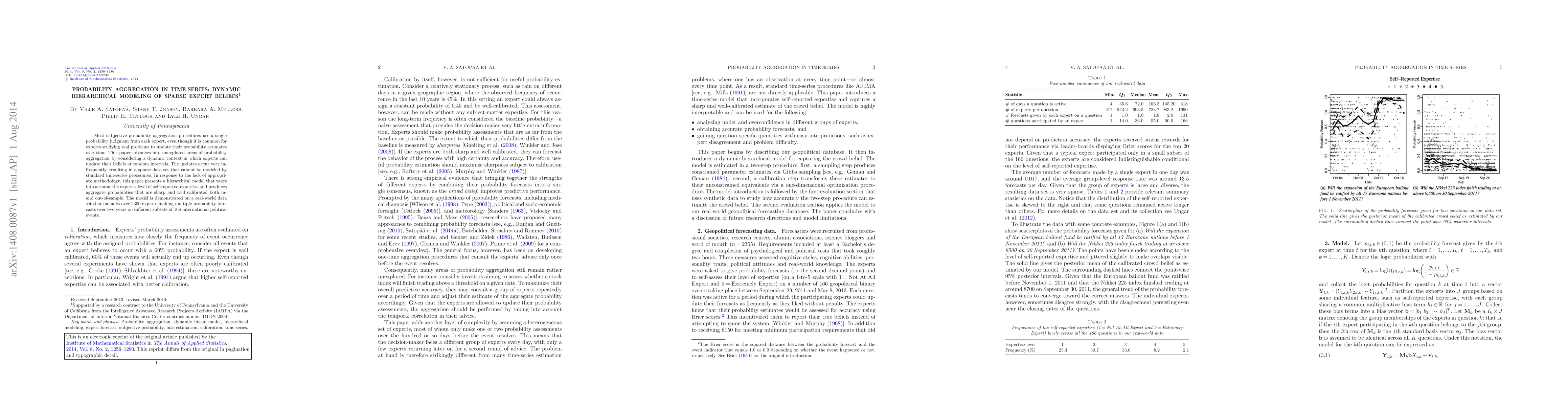 Most subjective probability aggregation procedures use a single probability judgment from each expert, even though it is common for experts studying real problems to update their probability estimates over time. This paper advances into unexplored areas of probability aggregation by considering a dynamic context in which experts can update their beliefs at random intervals. The updates occur very infrequently, resulting in a sparse data set that cannot be modeled by standard time-series procedures. In response to the lack of appropriate methodology, this paper presents a hierarchical model that takes into account the expert's level of self-reported expertise and produces aggregate probabilities that are sharp and well calibrated both in- and out-of-sample. The model is demonstrated on a real-world data set that includes over 2300 experts making multiple probability forecasts over two years on different subsets of 166 international political events.