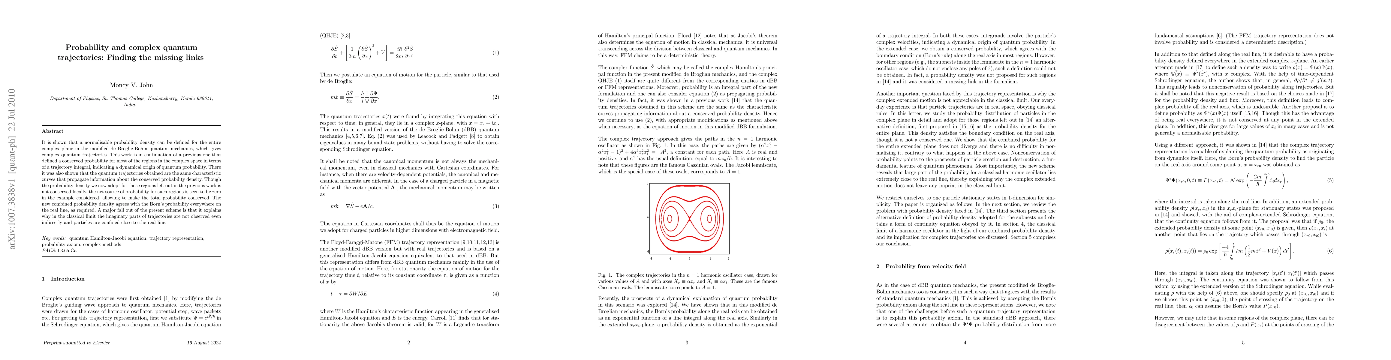 This paper extends modified de Broglie-Bohm quantum mechanics to define a normalisable probability density across the entire complex plane, providing complex quantum trajectories. It reconciles conserved probability in complex space with the Born's probability on the real line, explaining the classical limit's confinement of particles near the real axis.