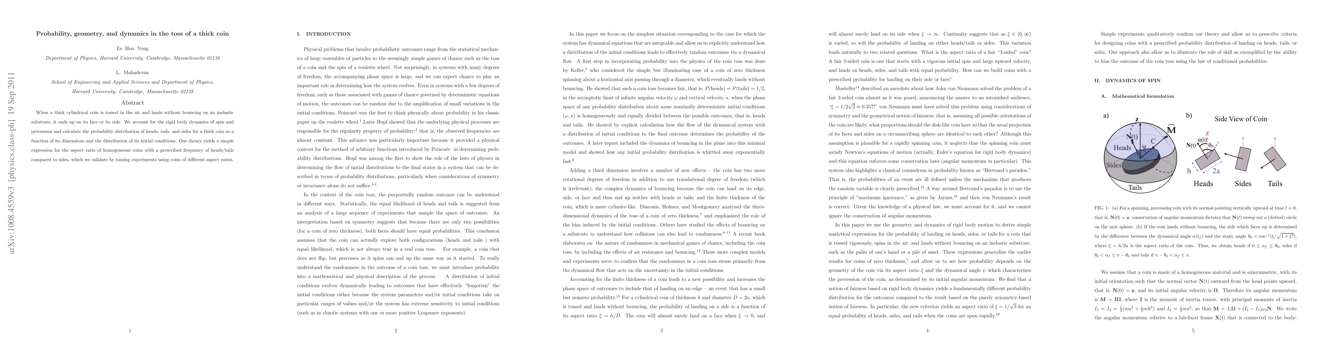 Researchers studied how thick coins land on their faces or sides when tossed, finding a simple formula to predict which outcome is more likely based on the coin's shape and initial conditions.