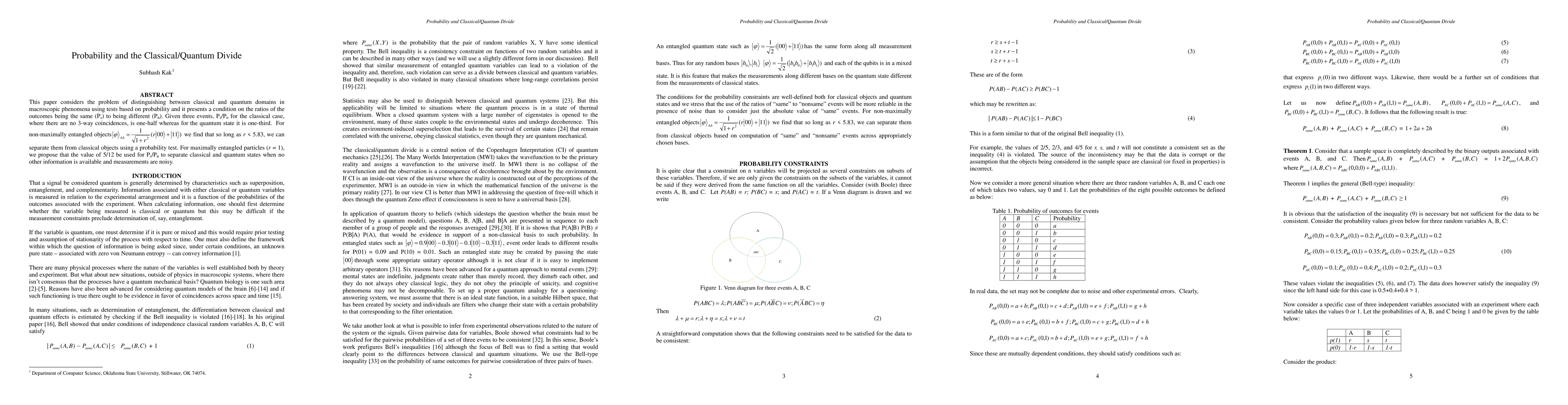 This paper considers the problem of distinguishing between classical and quantum domains in macroscopic phenomena using tests based on probability and it presents a condition on the ratios of the outcomes being the same (Ps) to being different (Pn). Given three events, Ps/Pn for the classical case, where there are no 3-way coincidences, is one-half whereas for the quantum state it is one-third. For non-maximally entangled objects we find that so long as r < 5.83, we can separate them from classical objects using a probability test. For maximally entangled particles (r = 1), we propose that the value of 5/12 be used for Ps/Pn to separate classical and quantum states when no other information is available and measurements are noisy.