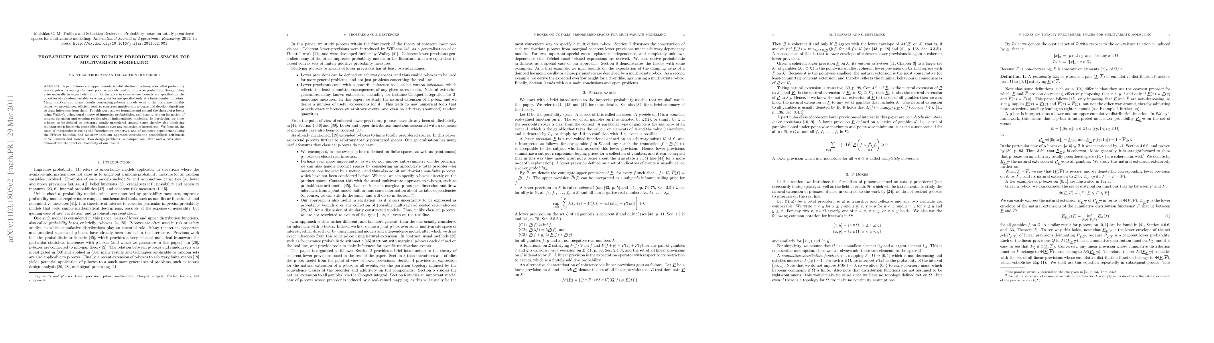 A pair of lower and upper cumulative distribution functions, also called probability box or p-box, is among the most popular models used in imprecise probability theory. They arise naturally in expert elicitation, for instance in cases where bounds are specified on the quantiles of a random variable, or when quantiles are specified only at a finite number of points. Many practical and formal results concerning p-boxes already exist in the literature. In this paper, we provide new efficient tools to construct multivariate p-boxes and develop algorithms to draw inferences from them. For this purpose, we formalise and extend the theory of p-boxes using Walley's behavioural theory of imprecise probabilities, and heavily rely on its notion of natural extension and existing results about independence modeling. In particular, we allow p-boxes to be defined on arbitrary totally preordered spaces, hence thereby also admitting multivariate p-boxes via probability bounds over any collection of nested sets. We focus on the cases of independence (using the factorization property), and of unknown dependence (using the Fr\'echet bounds), and we show that our approach extends the probabilistic arithmetic of Williamson and Downs. Two design problems---a damped oscillator, and a river dike---demonstrate the practical feasibility of our results.