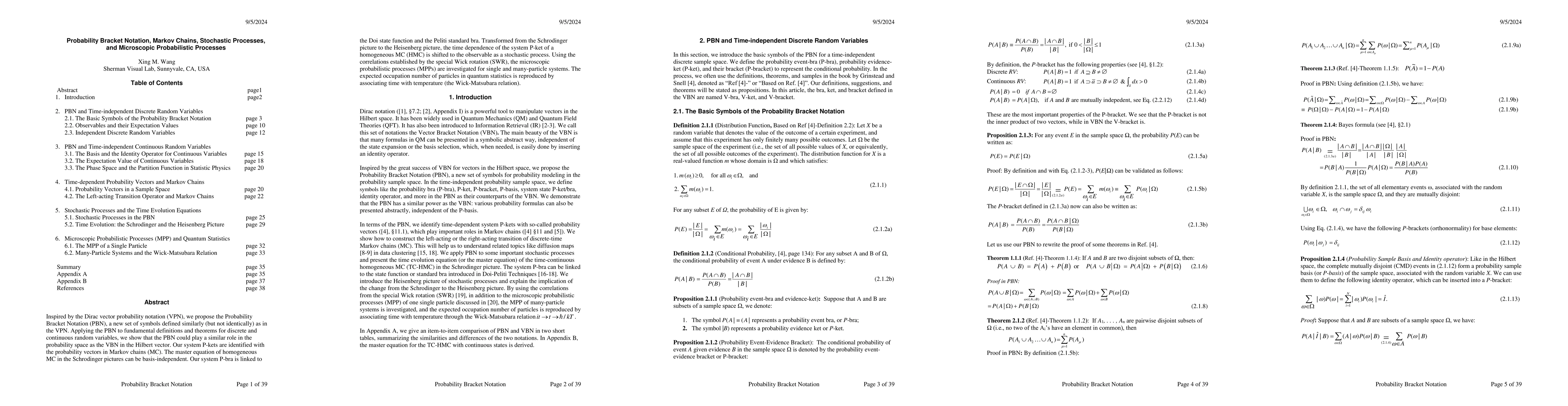 Inspired by the Dirac vector probability notation (VPN), we propose the Probability Bracket Notation (PBN), a new set of symbols defined similarly (but not identically) as in the VPN. Applying the PBN to fundamental definitions and theorems for discrete and continuous random variables, we show that the PBN could play a similar role in the probability space as the VBN in the Hilbert vector. Our system P-kets are identified with the probability vectors in Markov chains (MC). The master equation of homogeneous MC in the Schrodinger pictures can be basis-independent. Our system P-bra is linked to the Doi state function and the Peliti standard bra. Transformed from the Schrodinger picture to the Heisenberg picture, the time dependence of the system P-ket of a homogeneous MC (HMC) is shifted to the observable as a stochastic process. Using the correlations established by the special Wick rotation (SWR), the microscopic probabilistic processes (MPPs) are investigated for single and many-particle systems. The expected occupation number of particles in quantum statistics is reproduced by associating time with temperature (the Wick-Matsubara relation).