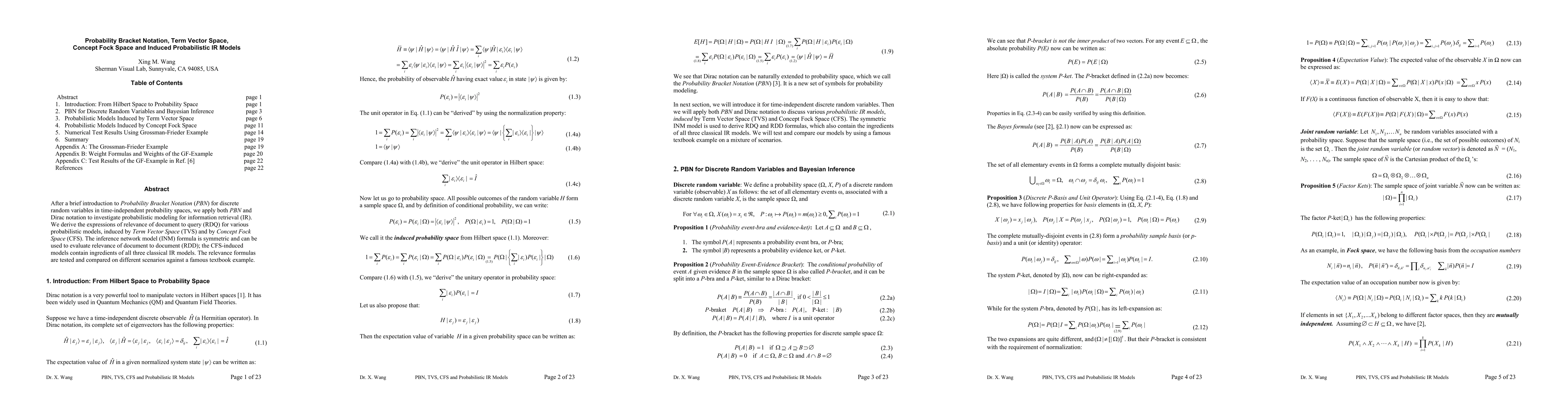 After a brief introduction to Probability Bracket Notation (PBN) for discrete random variables in time-independent probability spaces, we apply both PBN and Dirac notation to investigate probabilistic modeling for information retrieval (IR). We derive the expressions of relevance of document to query (RDQ) for various probabilistic models, induced by Term Vector Space (TVS) and by Concept Fock Space (CFS). The inference network model (INM) formula is symmetric and can be used to evaluate relevance of document to document (RDD); the CFS-induced models contain ingredients of all three classical IR models. The relevance formulas are tested and compared on different scenarios against a famous textbook example.