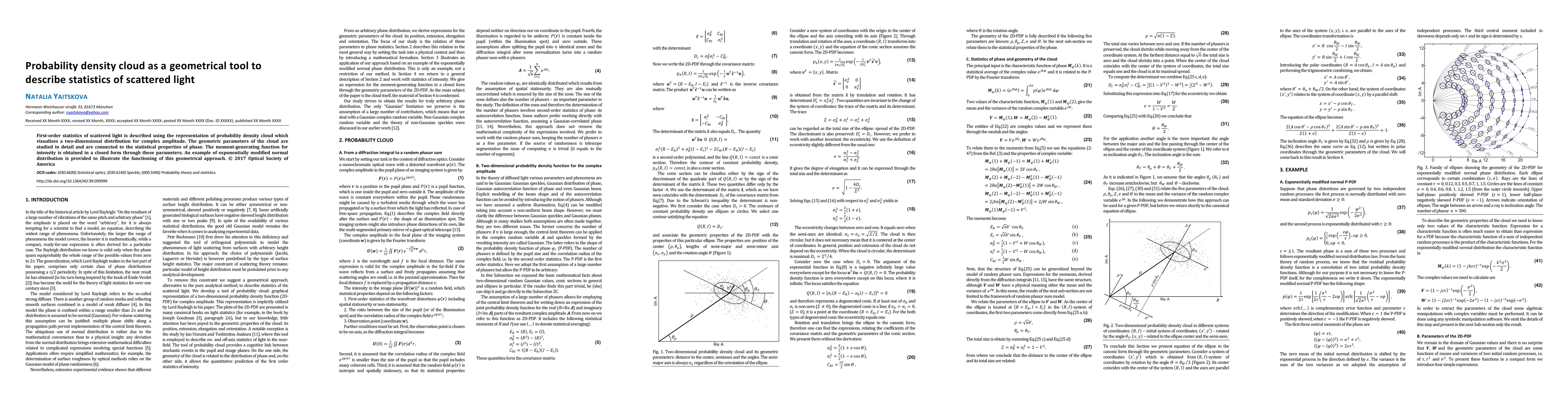 First-order statistics of scattered light is described using the representation of probability density cloud which visualizes a two-dimensional distribution for complex amplitude. The geometric parameters of the cloud are studied in detail and are connected to the statistical properties of phase. The moment-generating function for intensity is obtained in a closed form through these parameters. An example of exponentially modified normal distribution is provided to illustrate the functioning of this geometrical approach.