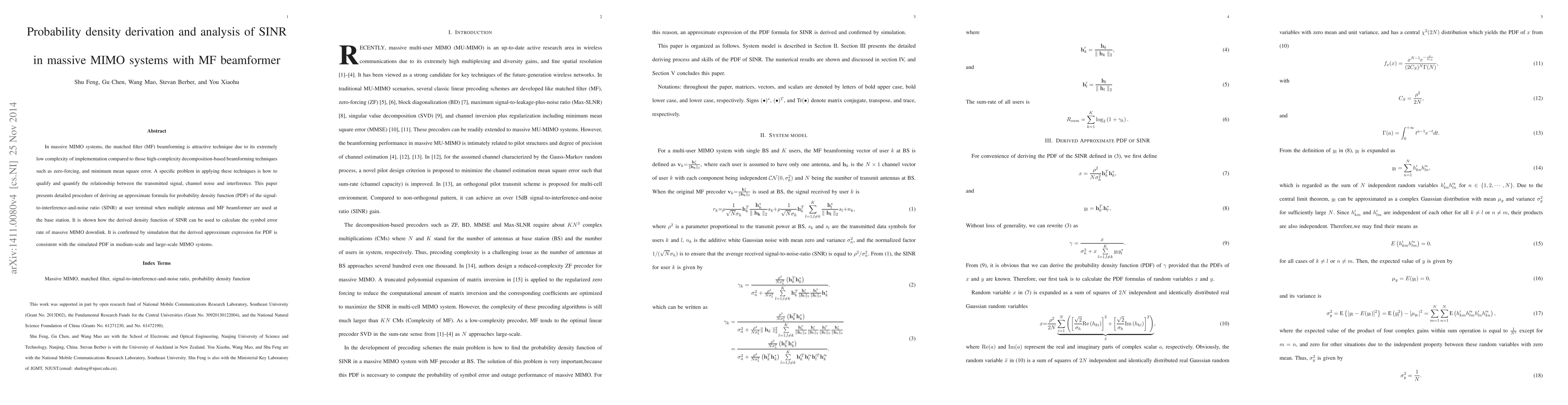 In massive MIMO systems, the matched filter (MF) beamforming is attractive technique due to its extremely low complexity of implementation compared to those high-complexity decomposition-based beamforming techniques such as zero-forcing, and minimum mean square error. A specific problem in applying these techniques is how to qualify and quantify the relationship between the transmitted signal, channel noise and interference. This paper presents detailed procedure of deriving an approximate formula for probability density function (PDF) of the signal-to-interference-and-noise ratio (SINR) at user terminal when multiple antennas and MF beamformer are used at the base station. It is shown how the derived density function of SINR can be used to calculate the symbol error rate of massive MIMO downlink. It is confirmed by simulation that the derived approximate expression for PDF is consistent with the simulated PDF in medium-scale and large-scale MIMO systems.