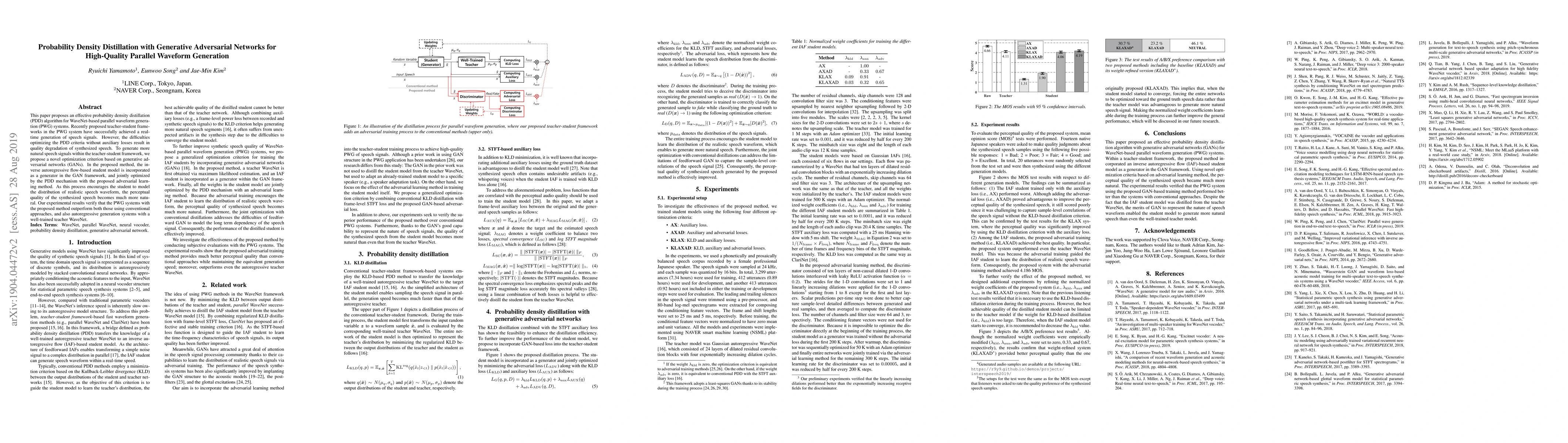 This paper introduces a probability density distillation algorithm combined with generative adversarial networks (GANs) to enhance the quality of parallel waveform generation in WaveNet-based systems. The proposed method optimizes the student model within a GAN framework, resulting in more natural and high-quality speech signals compared to conventional and autoregressive methods.