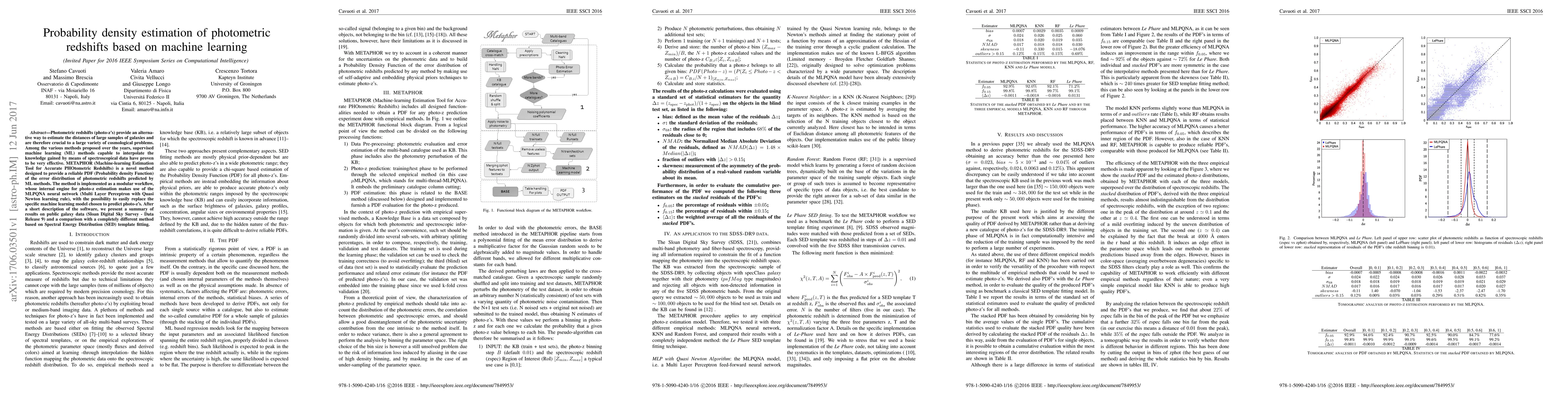 Photometric redshifts (photo-z's) provide an alternative way to estimate the distances of large samples of galaxies and are therefore crucial to a large variety of cosmological problems. Among the various methods proposed over the years, supervised machine learning (ML) methods capable to interpolate the knowledge gained by means of spectroscopical data have proven to be very effective. METAPHOR (Machine-learning Estimation Tool for Accurate PHOtometric Redshifts) is a novel method designed to provide a reliable PDF (Probability density Function) of the error distribution of photometric redshifts predicted by ML methods. The method is implemented as a modular workflow, whose internal engine for photo-z estimation makes use of the MLPQNA neural network (Multi Layer Perceptron with Quasi Newton learning rule), with the possibility to easily replace the specific machine learning model chosen to predict photo-z's. After a short description of the software, we present a summary of results on public galaxy data (Sloan Digital Sky Survey - Data Release 9) and a comparison with a completely different method based on Spectral Energy Distribution (SED) template fitting.