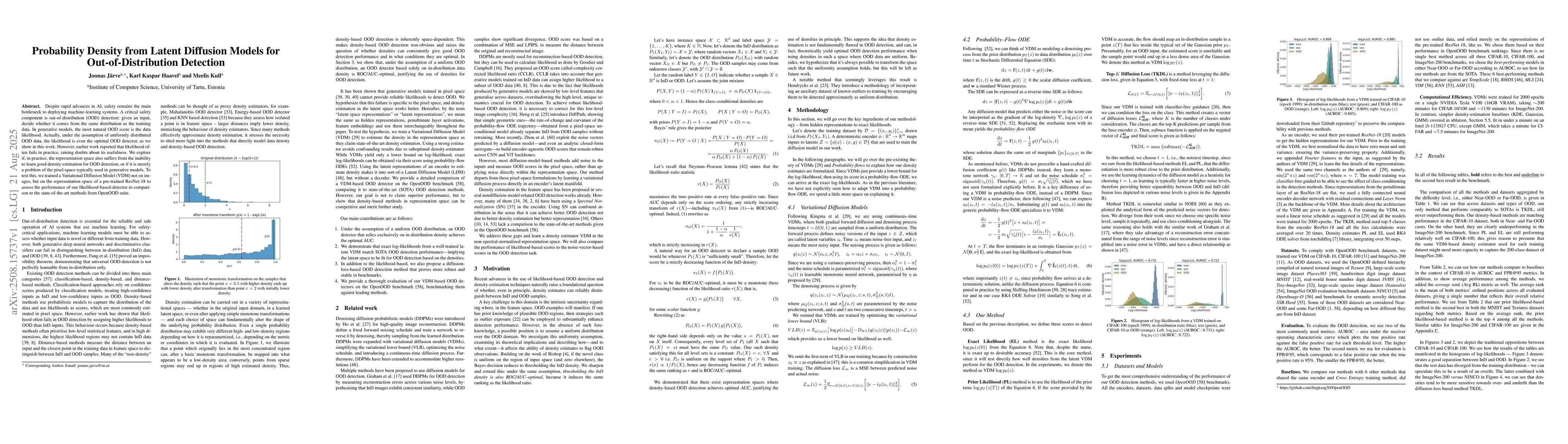Despite rapid advances in AI, safety remains the main bottleneck to deploying machine-learning systems. A critical safety component is out-of-distribution detection: given an input, decide whether it comes from the same distribution as the training data. In generative models, the most natural OOD score is the data likelihood. Actually, under the assumption of uniformly distributed OOD data, the likelihood is even the optimal OOD detector, as we show in this work. However, earlier work reported that likelihood often fails in practice, raising doubts about its usefulness. We explore whether, in practice, the representation space also suffers from the inability to learn good density estimation for OOD detection, or if it is merely a problem of the pixel space typically used in generative models. To test this, we trained a Variational Diffusion Model not on images, but on the representation space of a pre-trained ResNet-18 to assess the performance of our likelihood-based detector in comparison to state-of-the-art methods from the OpenOOD suite.