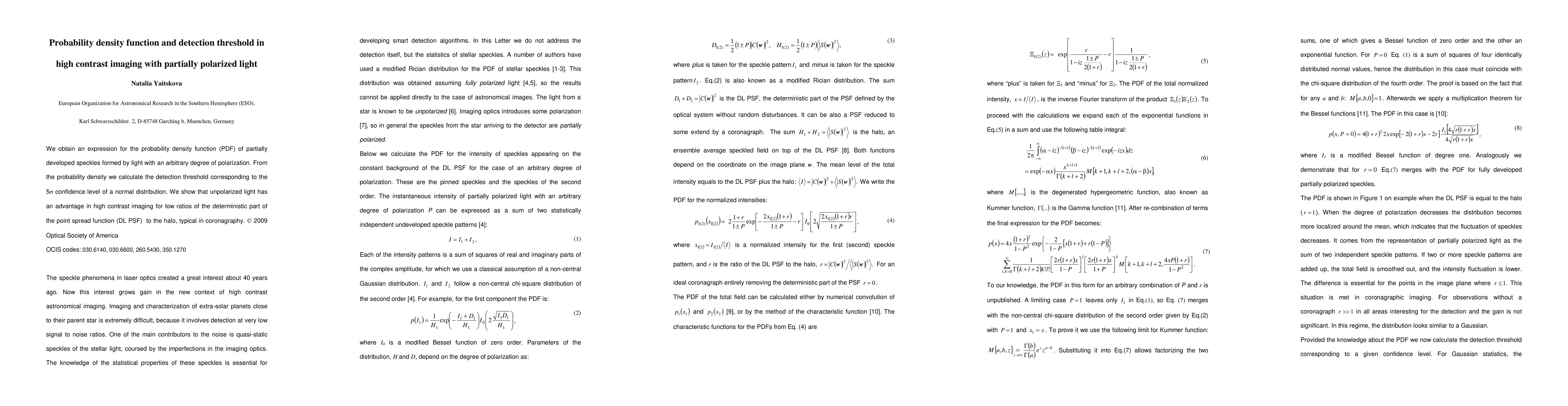 We obtain an expression for the probability density function (PDF) of partially developed speckles formed by light with an arbitrary degree of polarization. From the probability density we calculate the detection threshold corresponding to the 5sigma confidence level of a normal distribution. We show that unpolarized light has an advantage in high contrast imaging for low ratios of the deterministic part of the point spread function (DL PSF) to the halo, typical in coronagraphy.